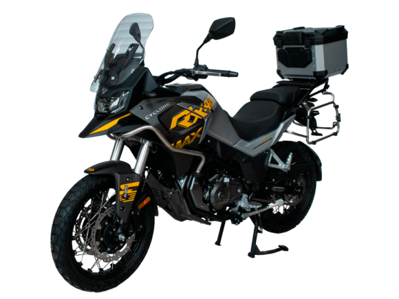 Мотоцикл CYCLONE RX401 (SR400GY-2D) – туристический эндуро, готовый бросить вызов любым дорогам и расстояниям. За рулём этого мотоцикла для вас не будет невозможных маршрутов. Его агрессивный дизайн всецело соответствует традициям жанра данного класса мототехники.Рядный двухцилиндровый четырёхтактный двигатель объёмом 401 см3 выдаёт 43 л.с. на 9500 об/мин. Максимальный крутящий момент достигается на 8000 об/мин и составляет 37 Н·м. Инжекторный впрыск топлива с блоком управления BOSCH увеличивает топливную экономичность, а также позволяет добиться высокой приёмистости и неприхотливости агрегата. Жидкостная система охлаждения не допустит перегрева двигателя даже при самом агрессивном вождении. На мотоцикл 6-ступенчатая механическая коробка передач.Максимальная скорость мотоцикла составляет 139 км/ч.RX401 оснащён спицованными алюминиевыми колёсами диаметром 17 и 19 дюймов. Колёса обуты в бескамерные покрышки от фирмы CST. С неровностями дороги эффективно справляются телескопическая вилка перевёрнутого типа спереди и маятник с моноамортизатором сзади. Ход передней подвески составляет 130 мм, задней – 55 мм. Оба компонента подвески являются регулируемыми. Эффективное и безопасное замедление с любых скоростей обеспечивают гидравлические дисковые тормоза с двухканальной системой ABS спереди и сзади.Клиренс мотоцикла составляет 185 мм. Объём топливного бака – 20 л. Снаряжённая масса – 215 кг.Мотоцикл отличает хорошо продуманная компоновка с высоко расположенным радиатором. На данной модели штатно установлены дуги безопасности, защита картера и двигателя, а также багажник с креплениями для боковых кофров. Кроме того, мотоцикл снабжён центральной подножкой для лёгкого обслуживания цепи, колес и вилки.Бортовой компьютер оборудован цветным дисплеем привлекательного дизайна со специальным защитным козырьком, спасающим от брызг и бликов. Из других приятных мелочей в допоборудовании мотоцикла стоит выделить 12-вольтовую розетку, подсветку пультов и USB-порт.Мотоцикл сочетает в себе отличные технические характеристики, комфорт и надёжность, что позволяет вам ощутить настоящую свободу на любой дороге с любым покрытием.