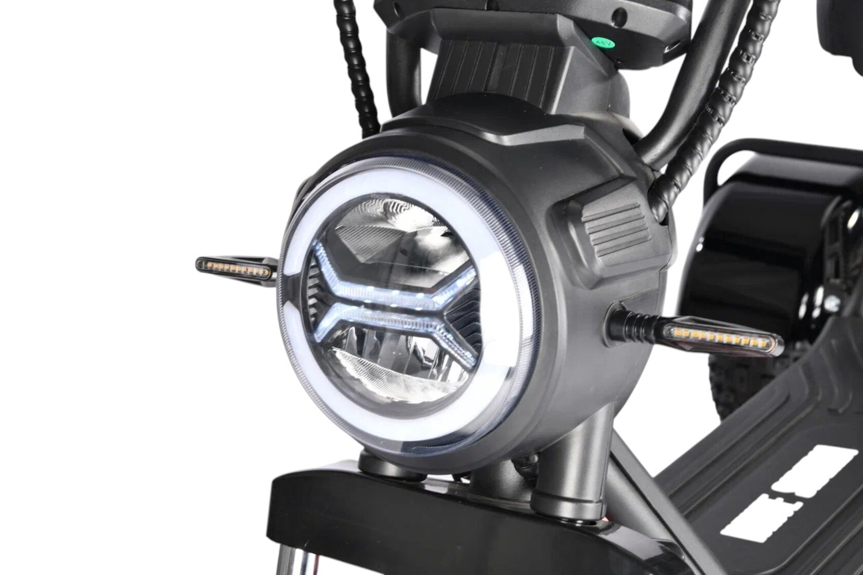 Оборудован одной мощной фарой, двумя стробоскопами, задними ходовыми огнями и поворотниками с ярким свечением;