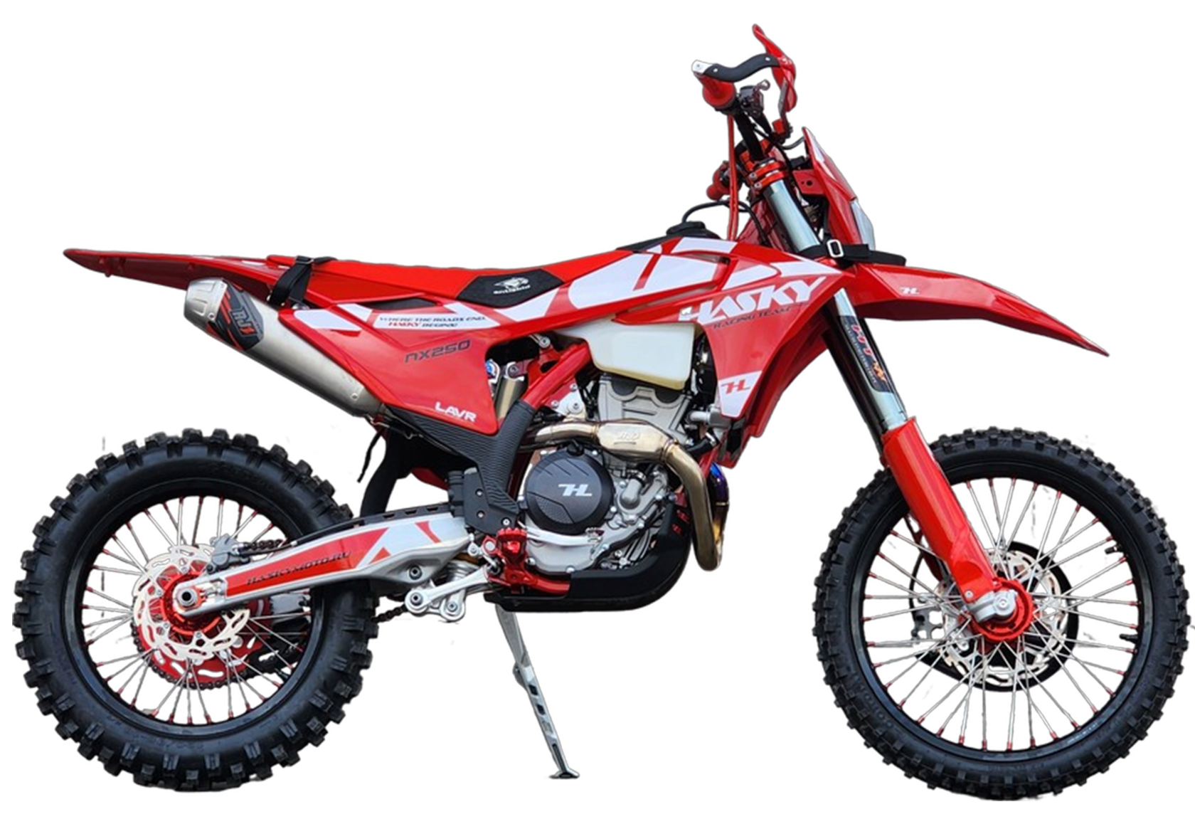 Hasky A10 PRO NX250 – легендарная мощность для настоящих победителейМотоцикл Hasky A10 PRO NX250 воплощает в себе 43 лошадиные силы неудержимой энергии и премиального качества. Этот полноразмерный байк на колесах 21/18 дюймов с новой рамой A10 и пластиком в стиле GasGas 2024 создан для тех, кто стремится к абсолютному лидерству.Сердцем модели стал инжекторный 4-клапанный двигатель ZS178MM-2 с системой Bosch и балансирным валом, выдающий впечатляющие 43 л.с. мощности. Шестиступенчатая коробка передач с электростартером и гидравлическим сцеплением AJ1 обеспечивает мгновенный отклик и полный контроль.Подвеска HTW T10 с 48-миллиметровыми перевернутыми вилками закрытого картриджа и прогрессивной характеристикой гарантирует идеальную управляемость. Титановая выхлопная система, траверсы CNC AJ1 двойного охвата и 360-градусная защита перьев вилки демонстрируют внимание к деталям.Тормозная система AJ1 (аналог Brembo) в сочетании с алюминиевыми ободами KKE, фрезерованными ступицами и подшипниками NSK обеспечивает непревзойденную безопасность. Комплектация включает усиленный руль из сплава 7075, пульты KTM, антискользящее сиденье AJ1, пеги и лапку КПП в стиле KTM.Защита двигателя, радиатора, рамы и тормозного диска дополнена буксировочными стропами. Покрышки Cordial на 18-дюймовом заднем и 21-дюймовом переднем колесах с 3-миллиметровыми камерами и фиксаторами AJ1 обеспечивают надежное сцепление.Дополнительные преимущества включают негорючий воздушный фильтр увеличенной площади, полностью влагозащищенную проводку, светодиодную фару с 4 линзами и комплект инструментов.