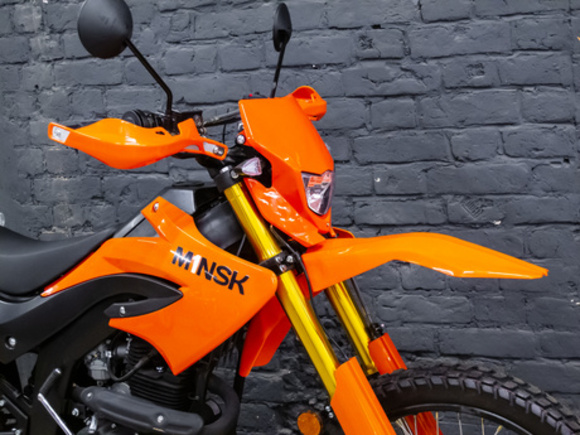 Эндуро мотоцикл Minsk X 250 оснащен двигателем мощностью 16 лошадиных сил и объемом двигателя 225 кубов, топливный бак объемом 10 литров которого хватит более чем на 500 км. Мотоцикл имеет воздушное охлаждение и электростартер, Также установлены дисковые тормоза, разгон до 120 километров в час. Минск Х250 выполнен в традиции бренда, но с учетом современных тенденций и требований. Стоит спортивный глушитель, в базовой комплектации оснащен поворотниками. Для крепежа фар использовались резиновые крепления. Износостойкая резина сохраняет сцепление с любой поверхностью. Данный мотоцикл это выбор тех, кто верен традициям, но всегда готов принять новые технологии, которые вносят в езду множество плюсов. MINSK относится к классу "Эндуро" от своего предшественника он отличается более мощным двигателем объем 225 кубов. Усиленная перевернутая передняя вилка, имеет защиту двигателя и рук, современная диодная оптика и электронный спидометром, наличием USB разъем для зарядки мобильных устройств. В целом мотоцикл Минск X 250 теперь выглядит современно и агрессивно. С этим байком двойного назначения можно быть уверенным в любой ситуации. Глушитель имеет контактный размер и спортивный вид, а помимо своей основной функции, существенно влияет на такие характеристики мотора, как мощность крутящий момент и экономичность. Пластик вокруг фары закрепляется на специальных резиновых креплениях для предотвращения поломок. Наличие поворотников позволяет использовать мотоцикл не только за городом, но и в городских. Высококачественная износостойкая резина с развитым протекторов отлично выдерживает сцепление на поворотах и обеспечивает уверенное торможение на любой дороге.