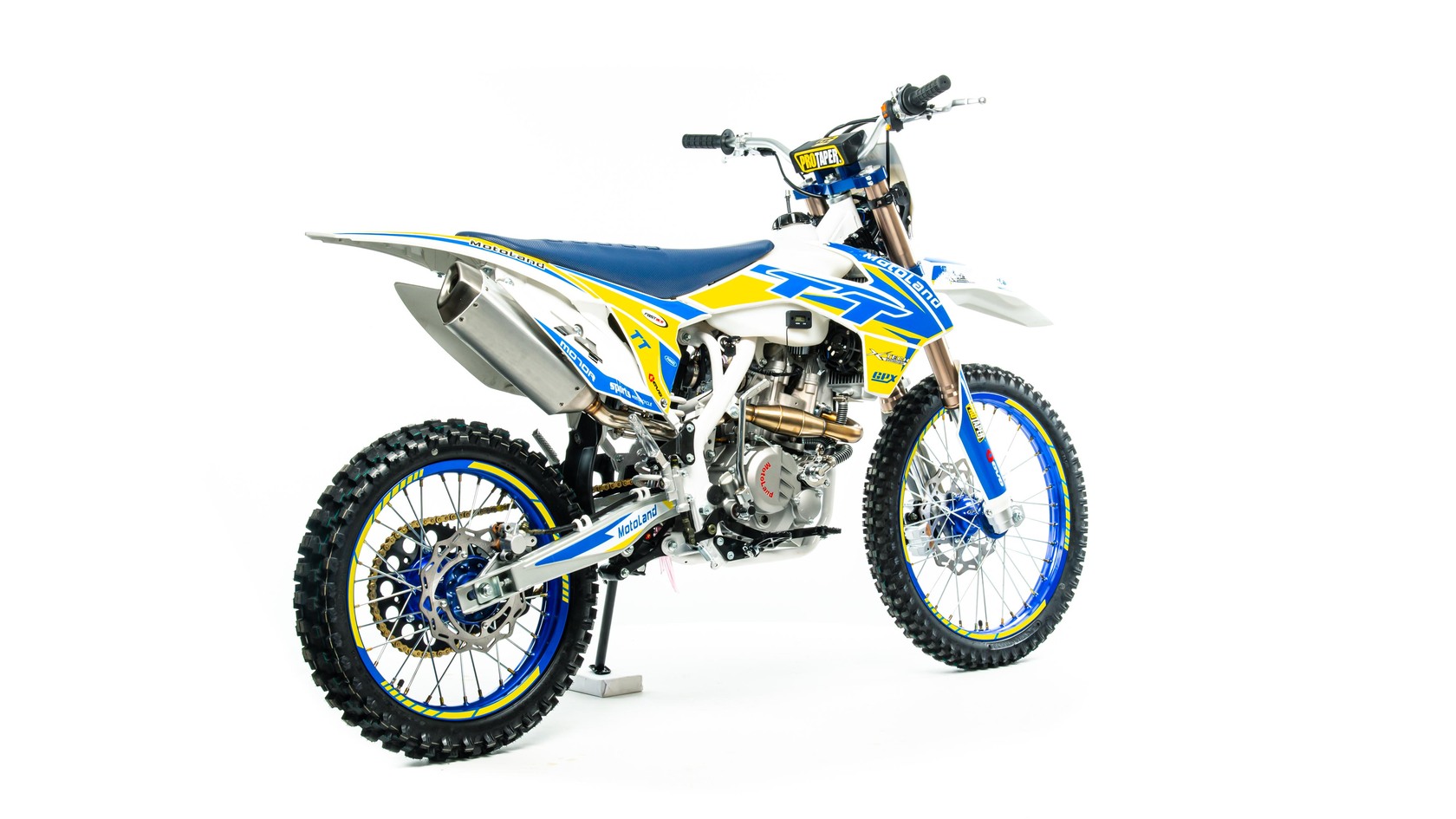 MotoLand TT 300 Новинка осени 2020 года.Надёжная техника из самых популярных компонентов оснащена Двигателем ZONGSHEN 174FMM с кикстартером и электростартером Мощностью 24 Л.С. на двигателе установлен Карбюратор NIBBI .Это полноразмерный кроссовый мотоцикл его база по осям составляет 1430 мм., и габаритами 2180х800х1300 мм. Высота по седлу составляет 950 мм., что по сравнению с Моделью XT 250 ST 21/19 ниже порядка 20 мм. Что позволяет комфортно себя чувствовать райдерам среднего роста.За счет сбалансированной базы мотоцикл имеет отличную управляемость, а конструкция рамы и особенности настройки подвески GPX способствуют максимальному поглощению неровностей дорожного покрытия, а так же усиленная прогрессия на игольчатых подшипниках.Алюминиевые обода c антибуксаторами, усиленными спицами и ступицами CNC. На кроссовой резине Yuanxing 80/100-21 / 100/90-18На мотоцикле установлена обновлённая тормозная система аналог «brembo» с медными колодками , что обеспечивает отличные тормозные характеристики. Особенностью заднего тормоза является, лапка верхнего расположения с эксцентриковой регулировкой.Выпускной патрубок с резонатором Power Bomb имеет крепления на пружинах для снижения вибрации. Глушитель с уникальным дизайном прямоточного типа, полностью алюминиевый для облегчения веса.
