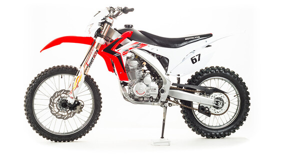 Обновленный мотоцикл Кросс 250см3 XR25FA ,это все тот-же мотоцикл только на данной модели установлены амортизаторы Fast Ace имеющая настройки сжатия и отбоя переднего и заднего амортизатора . Хорошее качество сборки и доступные цены на комплектующие позволяют поддерживать технику в исправном состоянии без больших затрат при любой интенсивности эксплуатации. Масса мотоцикла составляет порядка 120 кг. Габариты довольно большие – длина составляет 2000 мм., а высота по седлу – 920 мм., ширина руля- 830 мм. поэтому он отлично подойдет для тех, кто имеет рост от 175 см и выше.На мотоцикле установлен обычный для китайских кроссовых мотоциклов двигатель 169 FMM с 17 л.с. мощности, с воздушным охлаждением и рабочим объемом 230 кубов . Диаметр поршня движка составляет 65,5 мм, балансирный вал в конструкции не предусмотрен. Коленвал у мотоцикла Motoland XR 250 имеет палец диаметром 15 мм. Новые партии оснащаются карбюраторами PZ 30 с ускорительным насосом. Для удобства запуска мотора предусмотрен электростартер.Рычаги сцепления и тормоза – обычные, не складные. Передний тормозной диск имеет размер 280 мм., а размер заднего диска составляет 250 мм. Данный мотоцикл комплектуется колесами размерами 18/21 дюймов, размер задней покрышки – 110/90-18, передней- 80/100-21. Установлена 520-я цепь, передняя (ведущая) звезда имеет 13 зубов, задняя (ведомая) – 41 зуб.Подвеска у данной модели имеет стандартную прогрессию, как у большинства «китайцев». Размеры сальников прогрессии – 32х17х4, размеры подшипников – NK 17/16. Если Вам крайне важна качественная подвеска у мотоцикла, вместо предыдущей модели стоит купить Motoland 250 XR Fast Ace. Единственное отличие между ними заключается именно в этой детали, однако оно вносит немало нового в поведение транспорта, переводя его из чисто любительского класса уже в более профессиональный. Подвеска Fast Ace гораздо мягче стандартной, поэтому она во много раз лучше преодолевает неровности. Наличие регулировок позволяет подстроить амортизаторы под индивидуальные предпочтения. Размеры передних амортизаторов Fast Ace составляет d48x51, заднего амортизатора на данной модели составляют 470 мм. Задний маятник мотоцикла тоже стандартный, металлический.У модели Motoland XR 250 руль имеет переменное сечение: в месте установки его размер составляет 28 мм, а на концах под грипсами – 22 мм. Перевернутая вилка позволяет легче преодолевать любые неровности на дороге даже новичкам.Мотоцикл оснащен фарой головного света, что является необходимым условием для езды в сумерках и темноте. Если он покажется Вам недостаточно ярким, вместо стандартной лампы можно установить LED освещение или Биксенон. Переключение света осуществляется ключом зажигания.