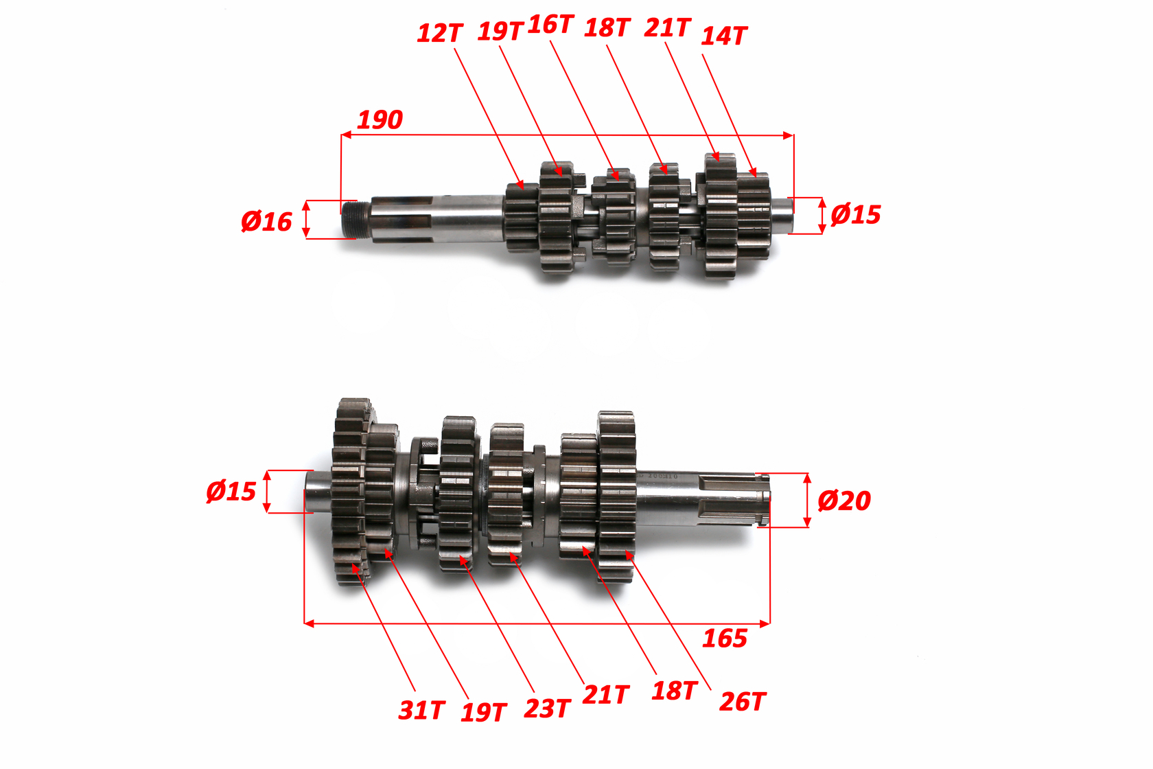 Валы КПП в сборе комплект ZS172FMM-3 PR, 6 передачПодходит на двигатели: ZS172FMM-5 (PR250), ZS172FMM-7 (CB250RL) с 6-ю передачами и без кик.стартера. Перед покупкой рекомендуем сверять размеры детали, указанные на фото или в описание.Оригинальные коды деталей по каталогу запасных частей Zongshen: 100081816 - первичный вал кпп в сборе100102589 - вторичный вал кпп в сборе