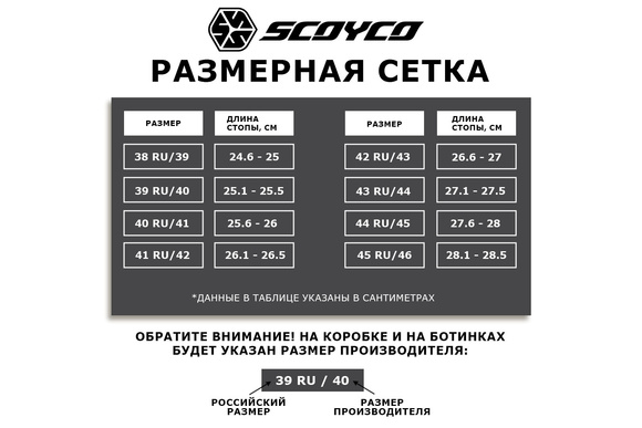 Scoyco MBM006: Полный контроль на бездорожьеМотоботы Scoyco MBM006 — созданы для тех, кто бросает вызов самым экстремальным трассам. Это ваш надежный союзник в мире мотокросса, эндуро и триала, обеспечивающий максимальную защиту, выносливость и комфорт.Ключевые преимущества:Превосходная защита: Усиленный пластиковый панцирь защищает голень, лодыжку и пятку. Регулируемый замок на щиколотке обеспечивает идеальную посадку.• Прочность и износостойкость: Комбинация кожзама и нейлона выдерживает экстремальные нагрузки. Усиленные зоны в критических точках продлевают срок службы.• Агрессивное сцепление: Шипастая резиновая подошва обеспечивает полный контроль над мотоциклом в любых условиях.• Комфорт и вентиляция: Дышащая подкладка и вентиляционные каналы эффективно отводят влагу и тепло.• Надежная фиксация: Две металлические пряжки и широкая липучка для быстрого и точного подгона.Технические характеристики:Бренд: ScoycoМодель: MBM006Назначение: Мотокросс, Эндуро, ТриалМатериал верха: Искусственная кожа, нейлон, текстильные вставкиЗащита: Носок, пятка, щиколотка (регулируемый замок), голеньПодкладка: Дышащая сетка, съёмная антибактериальная стелькаПодошва: Резиновая, масло- и бензостойкая, гибкаяЗастежка: 2 металлические пряжки + липучкаРазмеры: 39-48 (уточняйте наличие)Для кого:Профессиональные кроссмены и любители эндуро, которые ценят безопасность, контроль и результат на трассе.