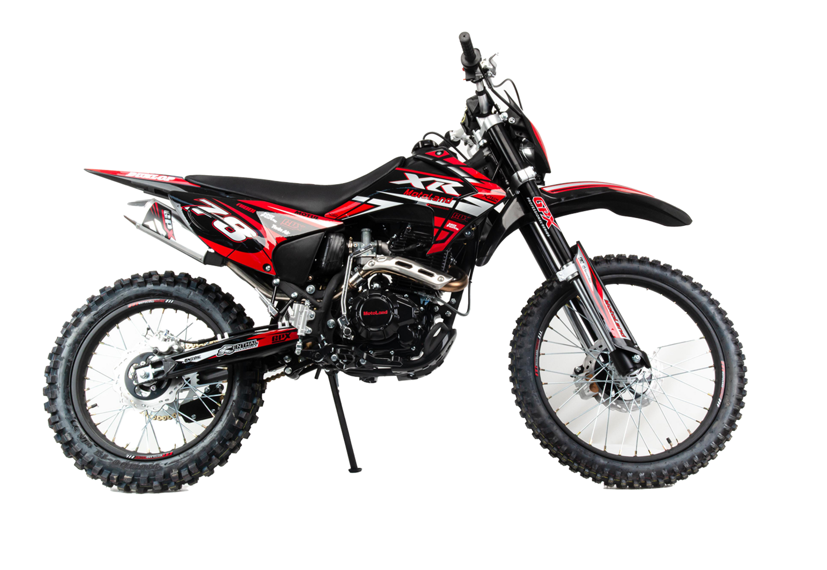 Купить Motoland 250 XR250 в стандартной комплектации будет неплохим решением для всех, кому нужен недорогой кроссовый мотоцикл, подходящий для езды по бездорожью, без выполнения прыжков и базовых трюков. Хорошее качество сборки и доступные цены на комплектующие позволяют поддерживать технику в исправном состоянии без больших затрат при любой интенсивности эксплуатации. Масса мотоцикла составляет порядка 130 кг. Габариты довольно большие – длина составляет 2000 мм., а высота по седлу – 920 мм., ширина руля- 830 мм. поэтому он отлично подойдет для тех, кто имеет рост от 175 см и выше.На мотоцикле установлен обычный для китайских кроссовых мотоциклов двигатель 169 FMM с 17 л.с. мощности, с воздушным охлаждением и рабочим объемом 230 кубов . Диаметр поршня движка составляет 65,5 мм, балансирный вал в конструкции не предусмотрен. Коленвал у мотоцикла Motoland XR 250 имеет палец диаметром 15 мм. Новые партии оснащаются карбюраторами PZ 30 с ускорительным насосом. Для удобства запуска мотора предусмотрен электростартер.Рычаги сцепления и тормоза – обычные, не складные. Передний тормозной диск имеет размер 280 мм., а размер заднего диска составляет 250 мм. Данный мотоцикл комплектуется колесами размерами 18/21 дюймов, размер задней покрышки – 110/90-18, передней- 80/100-21. Установлена 520-я цепь, передняя (ведущая) звезда имеет 13 зубов, задняя (ведомая) – 41 зуб.Подвеска у данной модели имеет стандартную прогрессию, как у большинства «китайцев». Размеры сальников прогрессии – 32х17х4, размеры подшипников – NK 17/16. Передние амортизаторы имеют размеры L=870 d51x55 мм., а задний – 460 мм, регулировки не предусмотрены. Задний маятник мотоцикла тоже стандартный, металлический.У модели Motoland XR 250 руль имеет переменное сечение: в месте установки его размер составляет 28 мм, а на концах под грипсами – 22 мм. Перевернутая вилка позволяет легче преодолевать любые неровности на дороге даже новичкам.Мотоцикл оснащен фарой головного света, что является необходимым условием для езды в сумерках и темноте. Если он покажется вам недостаточно ярким, вместо стандартной лампы можно установить LED освещение или Биксенон. Переключение света осуществляется ключом зажигания.