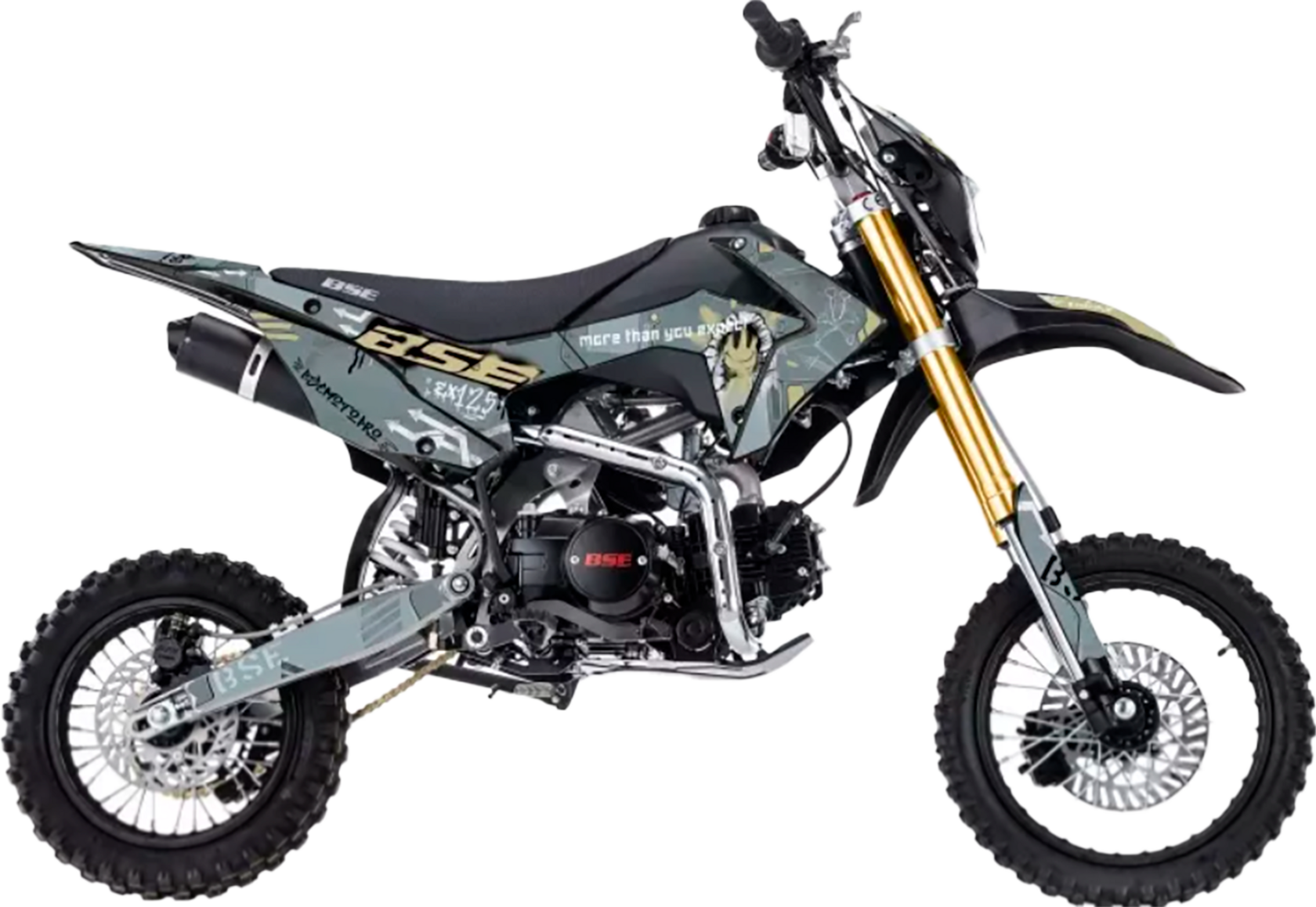 BSE EX 125e – это питбайк, созданный компанией BSE, предоставляющий отличные характеристики для любителей активного мотоциклетного опыта. С массой всего 75 кг и мощностью двигателя 10 л. с., этот бензиновый 1-цилиндровый 4-х тактный мотоцикл с легкостью подчеркивает свою маневренность и эффективность.Модель оснащена двигателем Zonsgshen ZS154FMI-2 объемом 125 см3, работающим по принципу 4-х тактного цикла, что обеспечивает плавное и экономичное движение. Система охлаждения воздушная, что способствует эффективному теплообмену в самых разнообразных условиях эксплуатации.BSE EX 125e обладает уникальной комбинацией передних и задних шин – 17" и 14" соответственно, что обеспечивает отличное сцепление с дорогой и устойчивость на разнообразных поверхностях. Система запуска включает кикстартер и электростартер, обеспечивая удобство использования в различных ситуациях.Телескопическая передняя подвеска и задний моноамортизатор гарантируют плавное и комфортное вождение на неровных дорогах. Дисковые тормоза спереди и сзади обеспечивают высокую степень безопасности и эффективный контроль при торможении.С трансмиссией типа механическая и системой подачи топлива через карбюратор, питбайк BSE EX 125e предоставляет надежность и простоту в управлении. Рама из стали обеспечивает прочность и долгий срок службы мотоцикла.Фары наличие питбайка делают его подходящим для использования в различных условиях освещения. Объем топливного бака составляет 3.5 литра, что позволяет ему преодолевать длинные расстояния на одном баке.Размеры в упаковке (142 х 43 х 64 см) и высота седла (860 мм) делают его компактным и удобным для хранения. Марка топлива – АИ-92, что является распространенным и доступным вариантом.