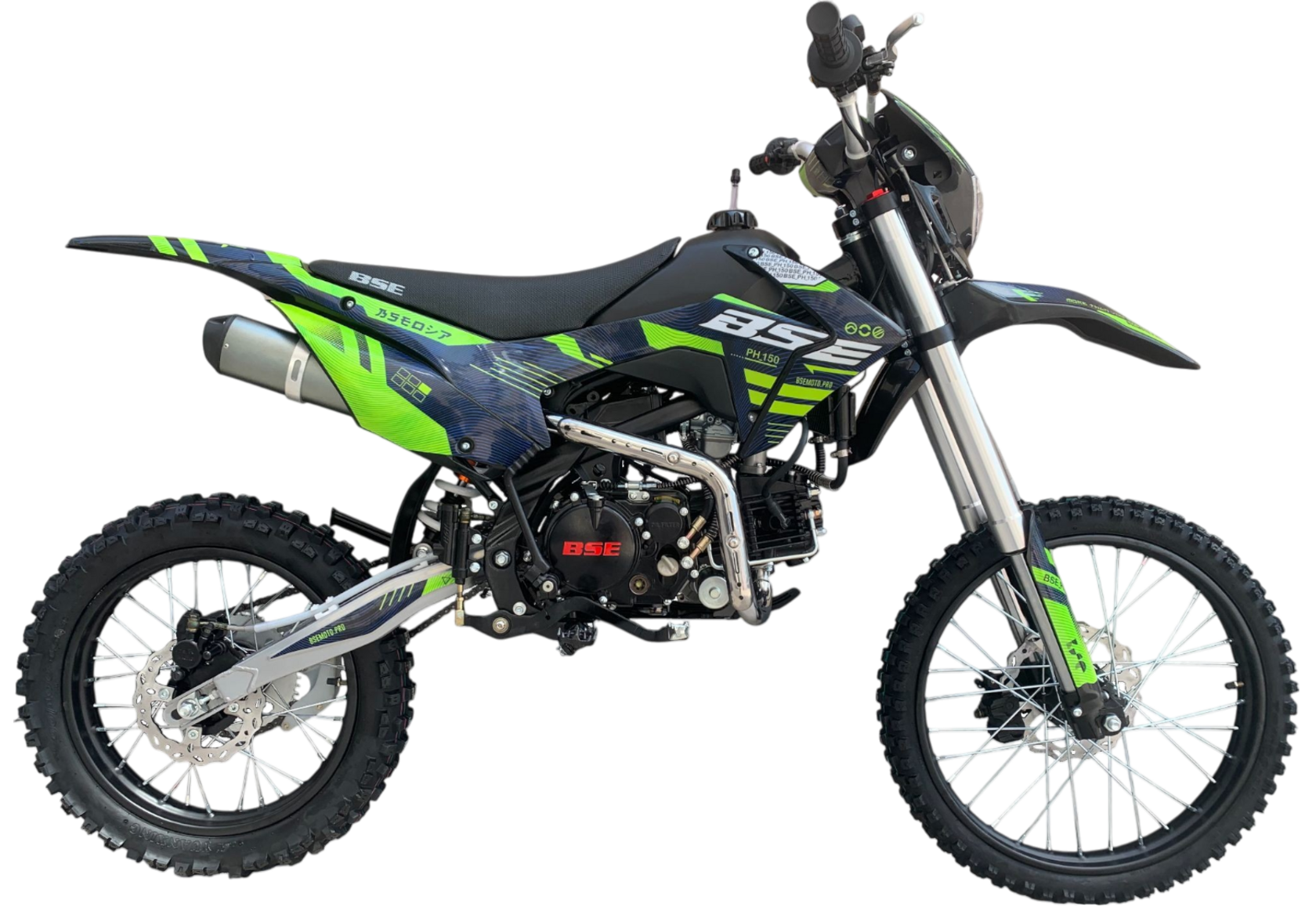 BSE PH150 – король питбайков в линейке BSE.PH150 на колесах 17/14 оснащен самым мощным двигателем среди питбайков BSE и самой богатой комплектацией.Основа PH150 - рама из хромомолибденовой стали повышенной жесткости с литыми усилителями — фирменный знак качества завода BOSUER! Силовая установка питбайка — надежный и тяговитый 4-тактным двигателем YX объёмом 150 см3 с воздушным охлаждением. Максимальная мощность – внушительные 15 л.с. Питает мотор карбюратор MIKUNI VM26. Питбайк оснащен 4-ступенчатой механической трансмиссией. Запуск мотора осуществляется при помощи электростартера или кик-стартера. Подвески с большими ходами: передняя — телескопическая вилка перевёрнуто типа, задняя — моноамортизатор.LED фара головного света, "злая" резина, мощная тормозная система HSK Racing, японские колесные подшипники NTN, защита мотора, руль ProTaper - питбайк полностью укомплектован всем необходимым для покатушек и гонок.PH150 – профессиональный выбор самого продвинутого "питбайкера".