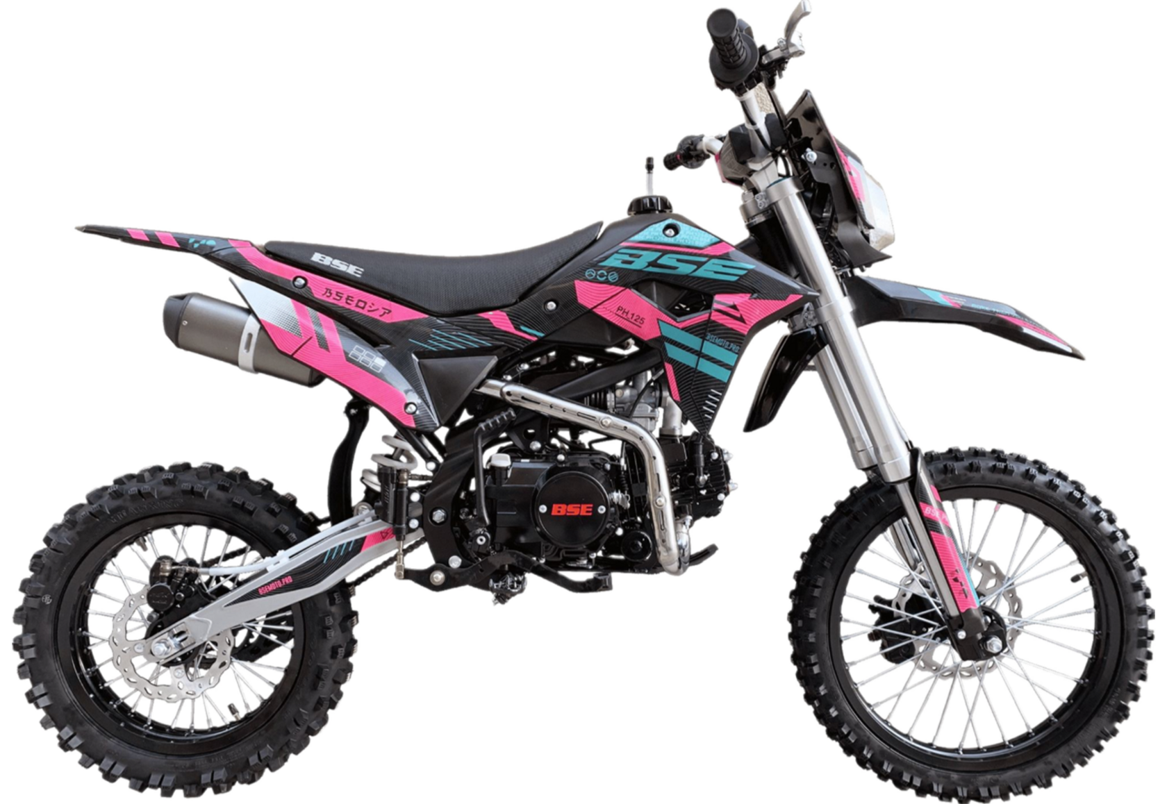 Питбайк BSE PH125 на колесах 17/14 дюймов – один из самых популярных, надежных и продаваемых питбайков 125 куб см среди китайских производителей! Этот классический питбайк объёмом 125 см3 обладает рядом модификаций и полезных усовершенствований, которые дополняют его функционал и отличают от конкурентов. PH125 оснащен колесами классическим для питбайка размером колес 17/14. Основа PH125 - рама из хромомолибденовой стали повышенной жесткости с литыми усилителями - фирменный знак качества завода BOSUER! Cиловая установка питбайка – надежный, тяговитый и мощный 4-тактный двигатель Zonghshen 125 куб см с воздушным охлаждением и мощностью 10 лс. Питает мотор карбюратор Jingke PZ 26. Питбайк оснащен 4-ступенчатой механической трансмиссией. Запуск мотора осуществляется при помощи электростартера или кик-стартера. Подвески с большими ходами: передняя - телескопическая вилка перевёрнуто типа, задняя- моноамортизатор. "Злая" резина, Мощная тормозная система HSK Racing, японские колесные подшипники NTN, усиленная цепь 428 Gold, защита мотора - питбайк полностью укомплектован всем необходимым для покатушек и гонок.