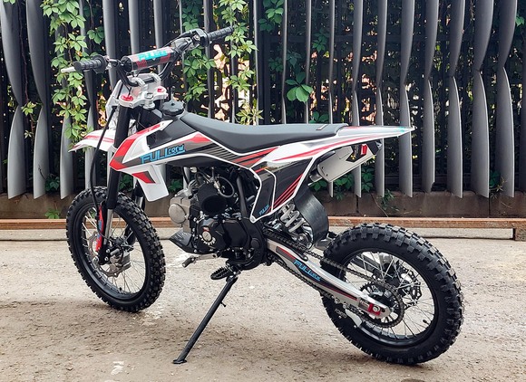 Питбайк Full Crew FC125e отлично подходит для пробующих мотоспорт – резвый мотор на 125 кубов с 9 лошадиными силами прекрасно работает с механической коробкой. Охлаждение воздушное – простая конструкция облегчает ремонт и удешевляет обслуживание. Для начинающих эта модель особенно интересна еще и из-за цены – можно основам научиться на нем с перспективой пересесть в дальнейшем на что-то более серьезное.Рама стальная усиленная, конструкция обеспечивает высокую удобную посадку, а подвеска (передняя перевернутая вилка и задний моноамортизатор) обеспечивает мягкое движение по кочкам, оврагам, деревьям и прочим всевозможным преградам на дикой трассе. Гидравлические тормоза работают надежно и четко.Из дополнительных приятных «плюшек»:- рычаги сцепления и тормоза откидываются;