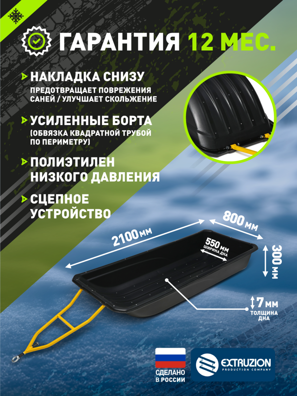 • Крупногабаритные сани-прицеп для профессионального использования с снегоходами и мотобуксировщиками. Увеличенная длина 2100 мм обеспечивает повышенную вместимость для перевозки объемных грузов. Изготовлены из сверхпрочного ПНД с УФ-стабилизацией. Полная комплектация сцепным устройством и стропами обвязки.