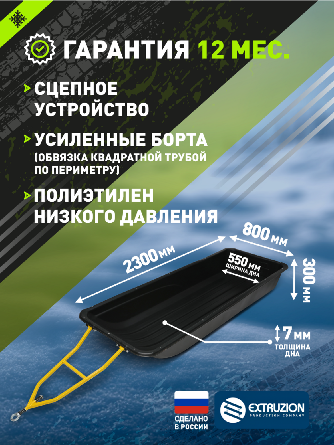• Крупногабаритные сани-прицеп для профессионального использования с снегоходами и мотобуксировщиками. Максимальная длина 2300 мм обеспечивает исключительную вместимость для перевозки особо объемных грузов. Изготовлены из сверхпрочного ПНД с УФ-стабилизацией. Полная комплектация сцепным устройством и стропами обвязки.