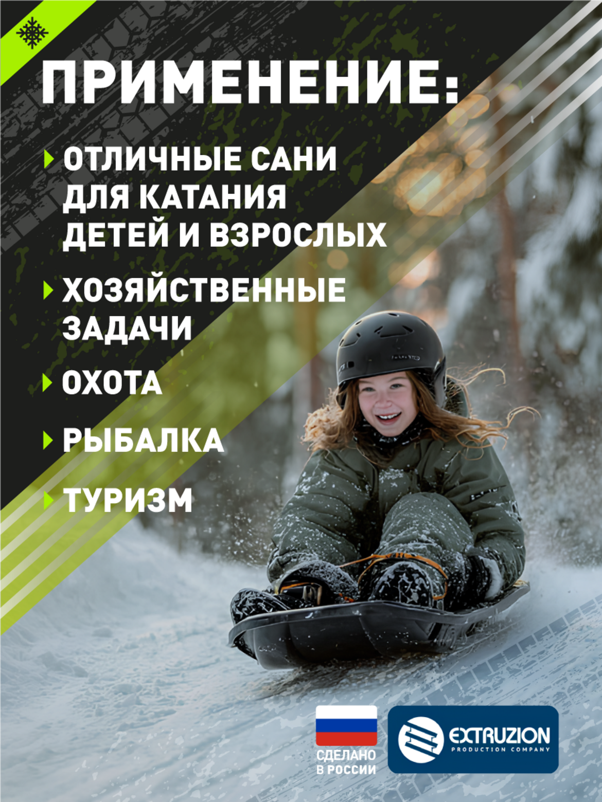 Санки ледянки для катания с горок (сани волокуши). На санях установлены люверсы, что облегчает крепление упряжки (буксировочной веревки). Сани произведены из ПНД (полиэтилен низкого давления) выдерживают перепады температуры -60С до +60С. Благодаря наличию светостабилизирующей добавки материал стоек к ультрофиалетовому излучени