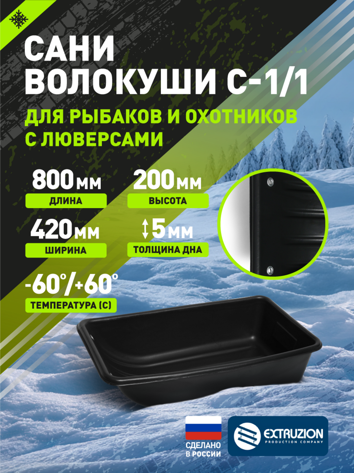 • Специализированные сани-волокуши для рыбалки и охоты, изготовленные из морозостойкого ПНД. Оснащены люверсами для удобного крепления буксировочной системы. Диапазон рабочих температур от -60C до +60C обеспечивает надежную эксплуатацию в экстремальных условиях.