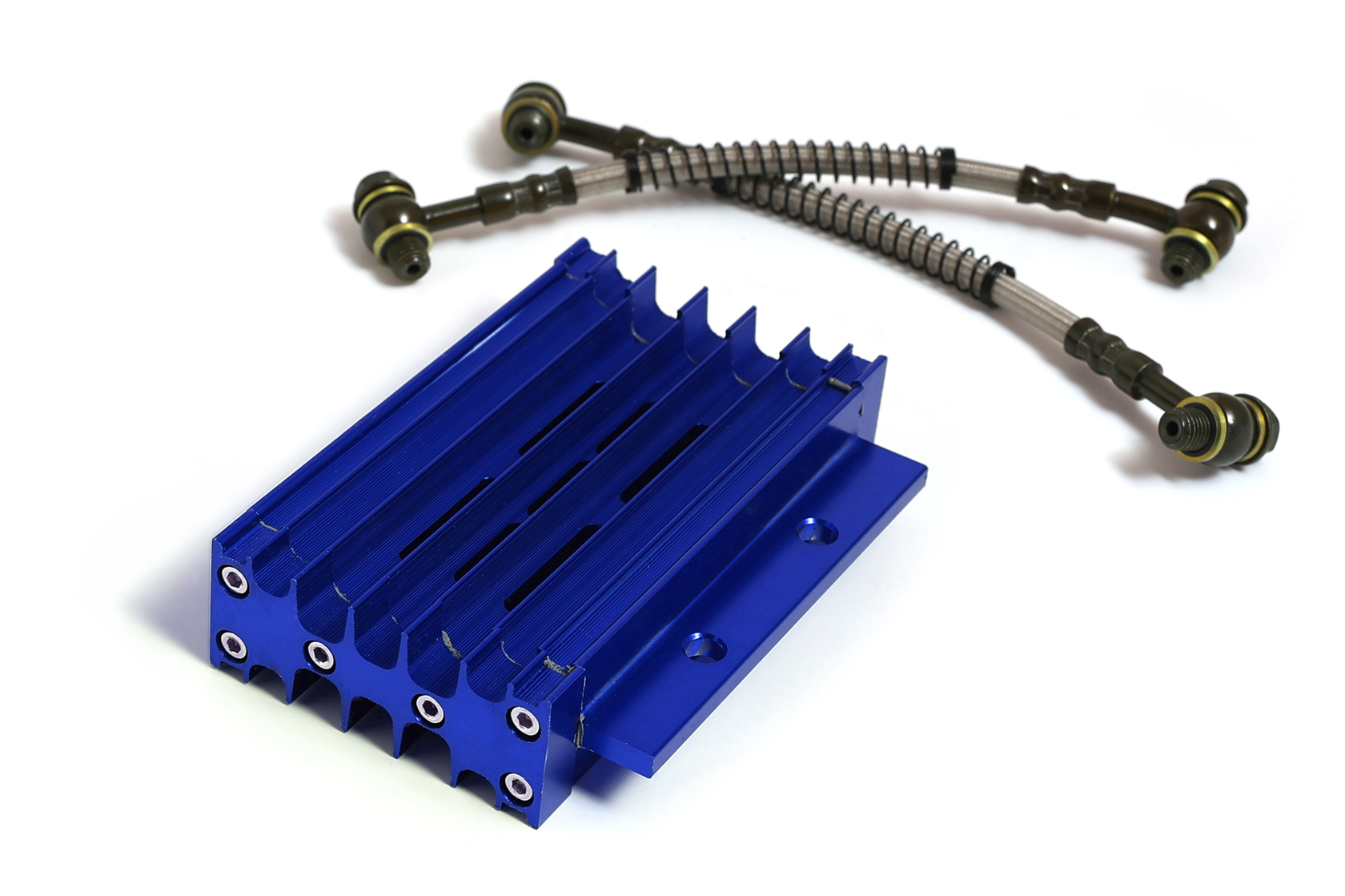 Высококачественный комплект радиатора масляного охлаждения с корпусом из прочного CNC-обработанного алюминия, с ярким синим анодированным покрытием. Предназначен для установки на 90% питбайков и мопедов с объёмом двигателя от 125 до 190 см³. Эффективно охлаждает масло, предотвращая перегрев двигателя и увеличивая его ресурс, особенно при активной эксплуатации.