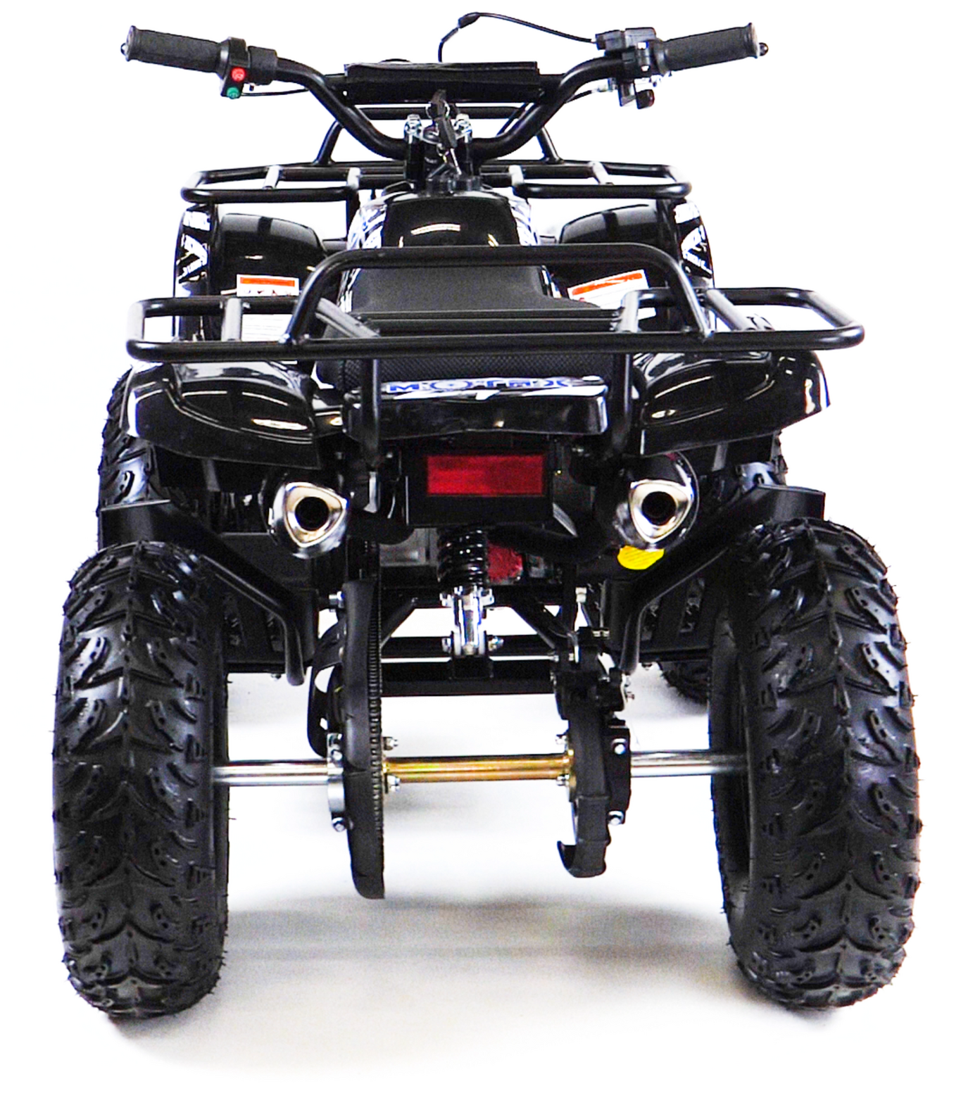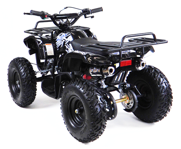 квадроцикл MOTAX GRIZLIK Х16 ES BW(с электростартером и родительским контролем). Отличие от остальных моделей кроется в названии. Этот квадроцикл оборудован 6-дюймовыми колёсами с шинами низкого давления и увеличенного размера, что позволяет получить больший ездовой комфорт и проходимость за счёт увеличенного клиренса.Отлично подойдёт для детей от 3 до 8 лет.Квадроцикл оборудован компактным, двухтактным бензиновым двигателем объёмом 50 куб. см. в паре с фрикционным сцеплением центробежного типа. Это обуславливает простоту и надежность конструкции. Квадроцикл имеет неплохую базовую комплектацию: он оборудован электрическим стартером, пультом дистанционного глушения и запуска двигателя, механическим ограничителем скорости, кнопкой быстрой остановки двигателя, яркими передними светодиодными фарами с режимом ближнего и дальнего света, раздвоенной системой выхлопа, механическим ручным стартером с механизмом легкого запуска. За счёт этого механизма существенно снижено усилие при запуске двигателя, с этой задачей может справиться и ребенок. Простота управления обусловлена фирменной передней подвеской полузависимого типа, которая позволяет сохранить стабильность в движении и лёгкость рулевого управления, что является важным фактором для ребёнка. Передние и задние механические дисковые тормоза способны эффективно остановить лёгкий и прочный квадроцикл. Детский квадроцикл оборудован передним и задним багажниками и прочным передним бампером. Эта модель отлично подойдёт как для получения первого опыта вождения, так и для активной езды по дачным дорожкам и лесопарковым зонам.