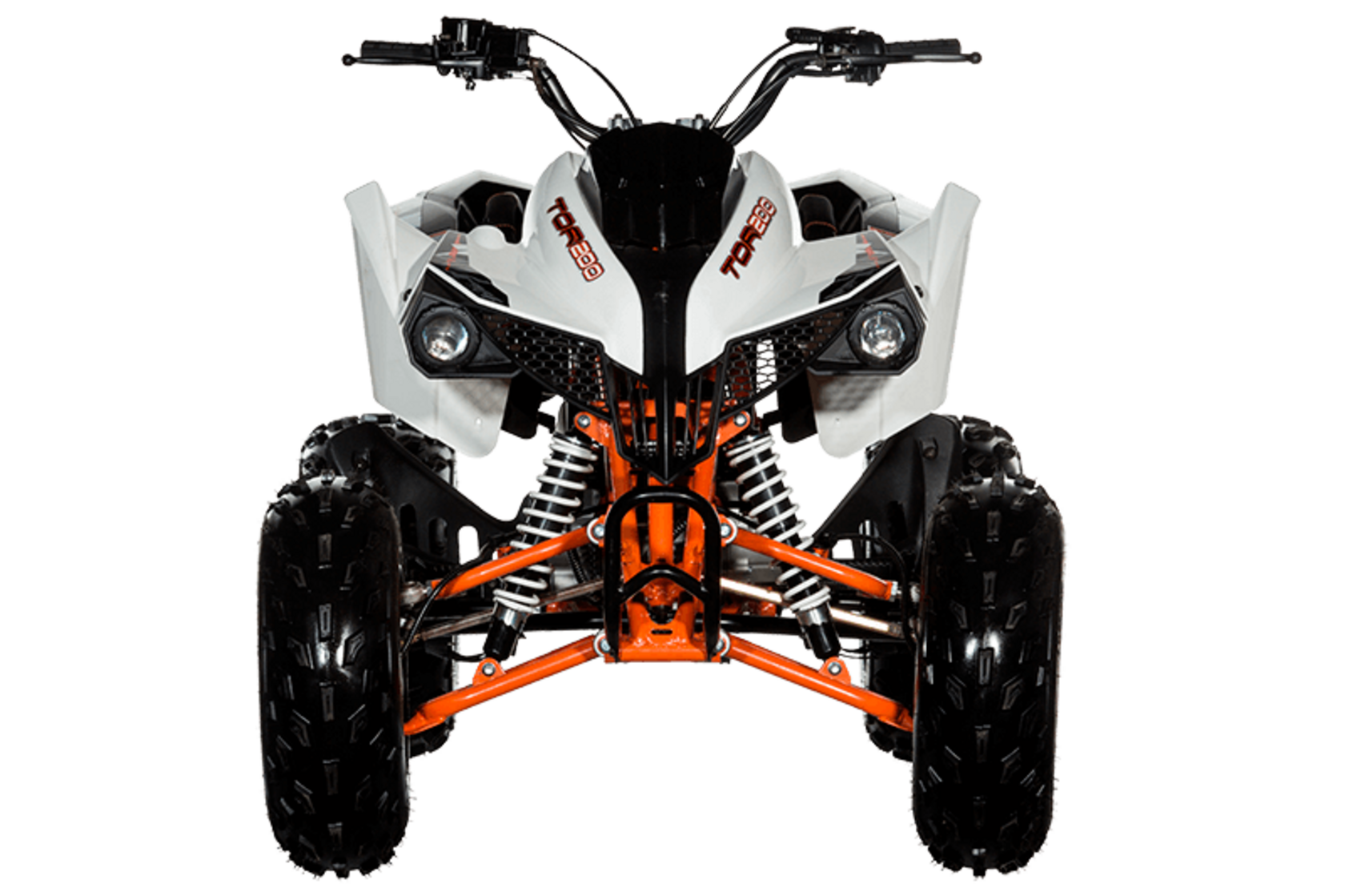 KAYO A200 - одна из топовых моделей в линейке мотовездеходов известного производителя. Популярный спортивный комплект отличают незаурядные показатели развиваемой мощности и широкие возможности практического применения. Данная модель может использоваться в качестве надежного транспорта для поездок по бездорожью, а также стать напарником для спортивных развлечений и активного отдыха.В раме установлен один из самых популярных моторов производства компании Zongshen - одноцилиндровый 4-тактник ZS165FMM рабочим объемом 199 см3, который в паре с карбюратором KEIHIN PZ30 способен выдавать 16 лошадиных сил максимальной мощности. Для поддержания оптимального температурного режима работы двигателя с балансирным валом и механической коробкой передач используется дополнительный контур масляного охлаждения.Подвеска квадроцикла KAYO A200 собрана с учетом особенностей использования модели: передние гидравлические амортизаторы с увеличенным ходом задействованы в независимой рычажной подвеске; задняя подвеска маятникового типа оснащена мощным моноамортизатором со ступенчатой регулировкой преднатяга пружины и параметров сжатия/отбоя.Электрооборудование данной модели представлено индикаторами нейтральной передачи и заднего хода, замком зажигания и кнопками старта/остановки двигателя. Максимальное удобство использования техники в условиях недостаточной освещенности и в темное время суток обеспечивают крупноформатные галогеновые фары с регулировкой положения светового пучка и задний габаритный фонарь, совмещенный со стоп-сигналом.