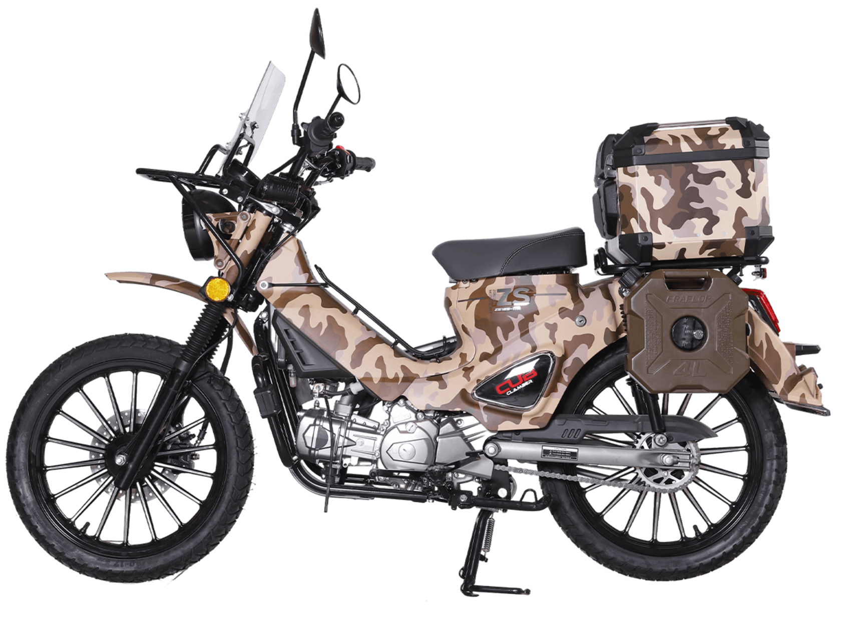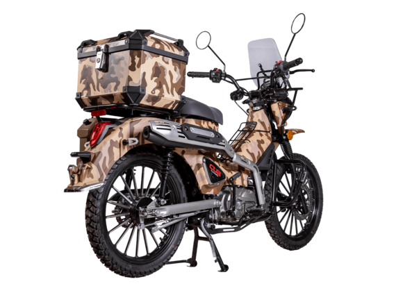 ATAKI Yemi Hunter – стильный мопед для настоящих охотников и рыбаков. Юркая модель с камуфляжным принтом и объёмными кофрами, готовая отправиться на лесные тропы.Силовая установка представлена одноцилиндровым 4-тактным двигателем с воздушным охлаждением. При объёме 120 см³ двигатель способен обеспечить мощность в 8,8 л.с. Бесперебойную работу в любых условиях обеспечивает карбюраторная система подачи топлива. Запуск двигателя осуществляется с помощью электростартера или кикстартера. Полуавтоматическая коробка передач имеет 4 ступени.Максимальная скорость 80 км/ч.Объём топливного бака 4,5 литра.На мопед установлены колёса диаметром 17 дюймов. Передняя подвеска – классическая телескопическая вилка, подвеска сзади – 2 гидравлических амортизатора. На оба колеса установлены гидравлические дисковые тормоза.Вес 102 кг. Колёсная база 1245 мм. Высота по седлу 765 мм.
