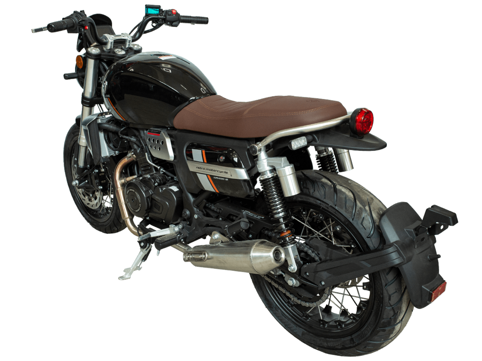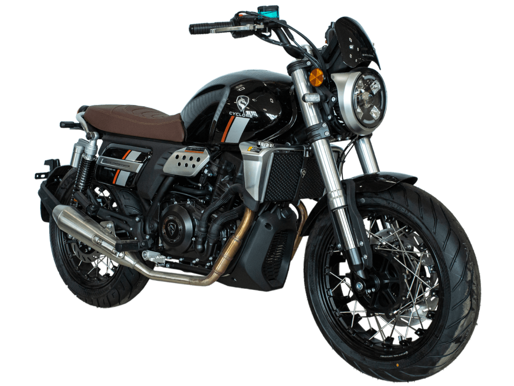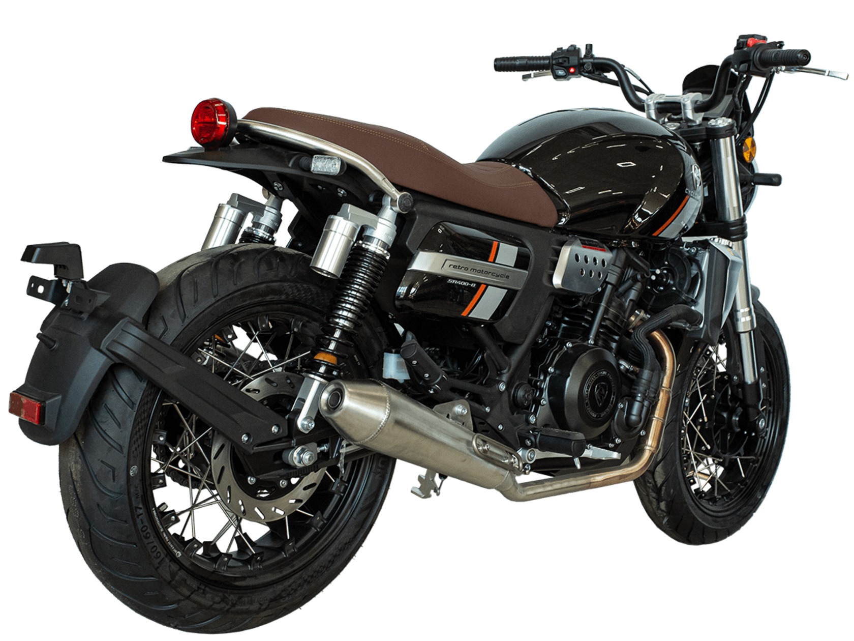 CYCLONE RE401 (SR400-B) 2024 – классик, в котором подчёркнутая простота объединяется с современными технологиями. Данная модель является более продвинутой версией модели RE3 (SR-400) – мотоцикл обладает более современным дизайном, снабжён стильными металлическими накладками на радиатор, а также топливным баком, объём которого увеличен до 20 литров.Двухцилиндровый четырёхтактный двигатель объёмом 401 см3 выдаёт 43 л.с. на 9500 об/мин. Инжекторный впрыск топлива с инжектором BOSCH увеличивает топливную экономичность, а также позволяет добиться высокой приёмистости и неприхотливости агрегата. Жидкостная система охлаждения не допустит перегрева двигателя даже при самом агрессивном вождении. На мотоцикл установлена 6-ступенчатая механическая коробка передач.Максимальная скорость мотоцикла составляет 150 км/ч.RE401 оснащён классическими спицованными колёсами диаметром 17 дюймов. Колёса обуты в бескамерные покрышки TIMSUN. С неровностями дороги эффективно справляются телескопическая вилка перевёрнутого типа спереди и маятник с двумя амортизаторами сзади. Ход передней подвески составляет 130 мм, задней – 81 мм. Оба компонента подвески являются регулируемыми. Эффективное и безопасное замедление с любых скоростей обеспечивают гидравлические дисковые тормоза с ABS спереди и сзади.Клиренс мотоцикла составляет 170 мм. Объём топливного бака – 20 л. Снаряжённая масса – 186 кг.Из дополнительного оборудования можно выделить USB-порт и датчики давления в шинах.Мотоцикл сочетает в себе отличные технические характеристики, комфорт и надёжность, что позволяет вам ощутить настоящую свободу на любой дороге.