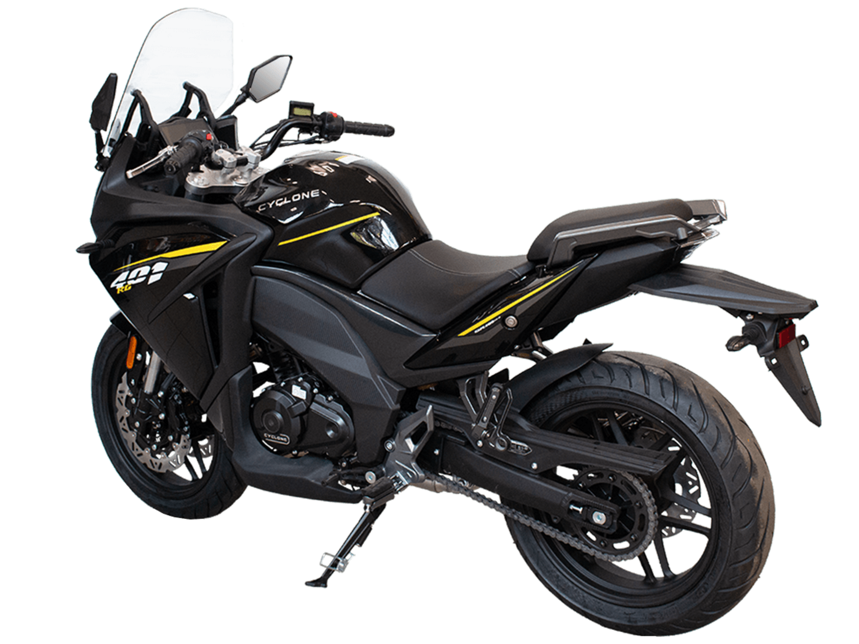 CYCLONE RG401 (SR400GS-B) – турист для покорения самых непростых и протяжённых маршрутов. Он обладает стремительным и современным дизайном в лучших “традициях жанра” туристических мотоциклов.Рядный двухцилиндровый четырёхтактный двигатель объёмом 401 см3 выдаёт 43 л.с. на 9500 об/мин. Максимальный крутящий момент достигается на 8000 об/мин и составляет 37 Н·м. Инжекторный впрыск топлива с блоком управления BOSCH увеличивает топливную экономичность, а также позволяет добиться высокой приёмистости и неприхотливости агрегата. Жидкостная система охлаждения не допустит перегрева двигателя а даже на самых непростых маршрутах. На мотоцикл установлена 6-ступенчатая механическая коробка передач.Максимальная скорость мотоцикла составляет 155 км/ч.RG401 оснащён литыми алюминиевыми дисками диаметром 17 дюймов. Колёса обуты в бескамерные покрышки TIMSUN. С неровностями дороги эффективно справляются телескопическая вилка перевёрнутого типа спереди и маятник с моноамортизатором сзади. Ход передней подвески составляет 120 мм, задней – 55 мм. Оба компонента подвески являются регулируемыми. Эффективное и безопасное замедление с любых скоростей обеспечивают гидравлические дисковые тормоза с двухканальной системой ABS спереди и сзади.Клиренс мотоцикла составляет 155 мм. Объём топливного бака – 21 л. Снаряжённая масса – 213 кг.Модель имеет два видеорегистратора, механическую регулировку ветрового стекла, датчики давления в шинах, подсветку пультов и два USB-порта. При желании можно оснастить мотоцикл двумя боковыми кофрами.Мотоцикл сочетает в себе отличные технические характеристики, комфорт и надёжность, что позволяет вам ощутить настоящую свободу на любой дороге.