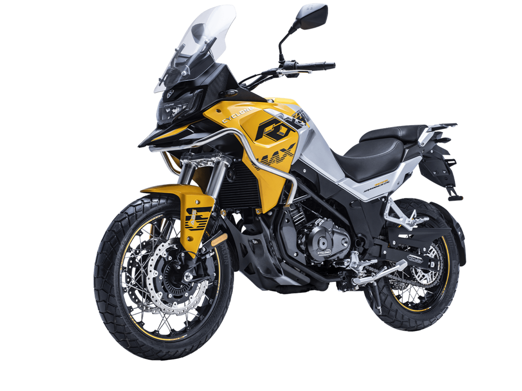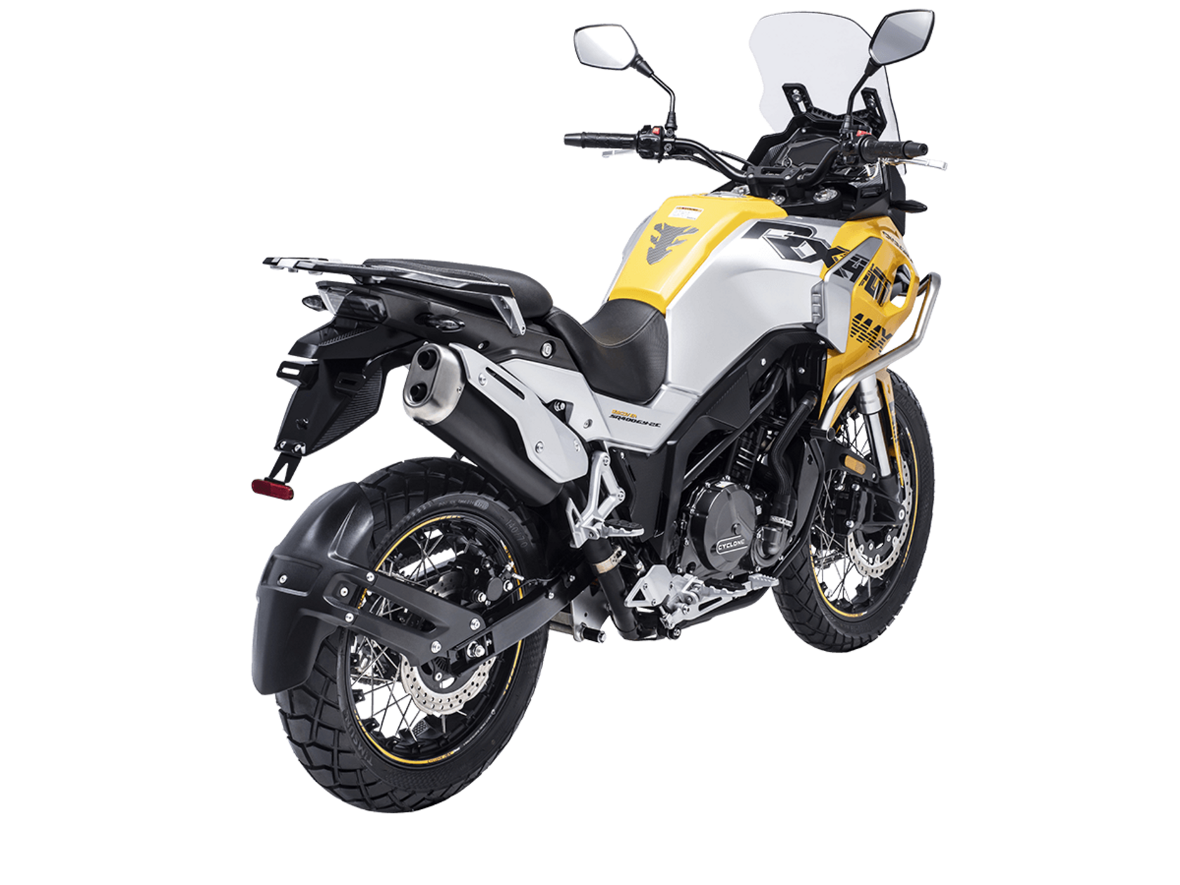 Мотоцикл CYCLONE RX401 2025 – туристический эндуро, готовый бросить вызов любым дорогам и расстояниям. За его рулём для вас не будет невозможных маршрутов!Оснащён рядным 2-цилиндровым 4-тактным двигателем DOHC объёмом 401 см³ с 4 клапанами на каждом цилиндре. Двигатель способен обеспечить мощность в 42,8 л.с. при 9500 об/мин, а максимальный крутящий момент 37 Н·м достигается на 8000 об/мин. Соотношение диаметра цилиндра и хода поршня 68х55,2 мм. Степень сжатия 11,6:1.Жидкостная система охлаждения не допустит перегрева двигателя даже при самом агрессивном вождении. Механическая коробка передач имеет 6 ступеней со схемой 1-N-2-3-4-5-6. Объём топливного бака 20 литров.Максимальная скорость мотоцикла 139 км/ч.Мотоцикл оснащён спицованными алюминиевыми колёсами диаметром 19 дюймов спереди и 17 сзади. Колёса обуты в бескамерные покрышки CST. В качестве передней подвески используется телескопическая вилка перевёрнутого типа, а сзади установлен маятник с моноамортизатором. Ход передней подвески 130 мм, задней – 55 мм. Оба компонента подвески регулируются. Для эффективного торможения используются гидравлические дисковые тормоза с 2-канальной ABS системой. Тормоза спереди представлены 2 тормозными дисками диаметром 305 мм с 4-поршневыми саппортами, а сзади расположен тормозной диск 258 мм с однопоршневым суппортом с плавающей скобой.Мотоцикл имеет продуманную конструкцию с высоко расположенным радиатором.Для освещения и сигнальных огней используется диодная светотехника. Данные от бортового компьютера выводятся на яркий цветной дисплей, оснащённый специальным козырьком для защиты от брызг и бликов. Имеются подсветка пультов, USB-порт, 12-вольтная розетка.Габариты 2160x860x1395 мм, снаряжённая масса 215 кг. Колёсная база 1410 мм, клиренс 185 мм, высота по седлу 810 мм.