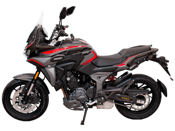 CYCLONE RX6 (SR650) – туристический эндуро для покорения самых непростых и протяжённых маршрутов. Он обладает агрессивным и современным дизайном, который выгодно выделяет его из всех остальных мотоциклов в своём классе. Мотоцикл дарит своему владельцу абсолютную свободу передвижения, позволяя долго и быстро ехать по шоссе, а при желании съезжать на такие дороги, по которым не проедет ни один дорожный мотоцикл. Небольшие габариты этого байка позволяют с успехом использовать его, как повседневный дорожный мотоцикл.Данная модель является самой крупнокубатурной в модельном ряде компании CYCLONE. Рядный двухцилиндровый четырёхтактный двигатель объёмом 650 см3 выдаёт мощность в 71 л.с. на 8500 об/мин. Максимальный крутящий момент достигается на 7000 об/мин и составляет 62 Н·м. Инжекторный впрыск топлива с блоком управления BOSCH увеличивает топливную экономичность, а также позволяет добиться высокой приёмистости и неприхотливости агрегата. Жидкостная система охлаждения не допустит перегрева двигателя даже при самом агрессивном вождении. На мотоцикл установлена 6-ступенчатая механическая коробка передач.Максимальная скорость мотоцикла составляет 180 км/ч.Модель оснащена литыми алюминиевыми дисками диаметром 17 дюймов. Колёса обуты в бескамерные покрышки от легендарной фирмы PIRELLI. С неровностями дороги эффективно справляются компоненты производства культовой японской компании KYB – телескопическая вилка перевёрнутого типа спереди и маятник с моноамортизатором сзади. Ход передней подвески составляет 130 мм, задней – 51 мм. Оба компонента подвески являются регулируемыми. Эффективное и безопасное замедление с любых скоростей обеспечивают гидравлические дисковые тормоза с двухканальной системой ABS спереди и сзади. Тормозные системы произведены известной испанской фирмой J.JUAN (входящей в легендарный холдинг BREMBO).Мотоцикл отличает хорошо продуманная компоновка с высоко расположенным радиатором. Высота 820 мм по седлу позволяет чувствовать себя комфортно даже райдерам небольшого роста. На данной модели установлена металлическая защита выхлопной системы и масляного фильтра. Под пассажирским сиденьем размещён небольшой, но крайне полезный набор инструментов.RX6 (SR650) оснащён бортовым компьютером с информативным цветным дисплеем и кнопками управления на руле, а также двумя штатными видеорегистраторами спереди и сзади. Из других приятных мелочей в допоборудовании мотоцикла стоит выделить регулируемое при помощи кнопки ветровое стекло, датчики давления в шинах, подсветку пультов, бесключевой доступ и 2 USB-порта.Клиренс мотоцикла составляет 165 мм. Объём топливного бака – 20 л. Снаряжённая масса – 245 кг.Мотоцикл сочетает в себе отличные технические характеристики, богатое оснащение, комфорт и надёжность, что позволяет вам ощутить настоящую свободу, отправившись на нём в любое путешествие.