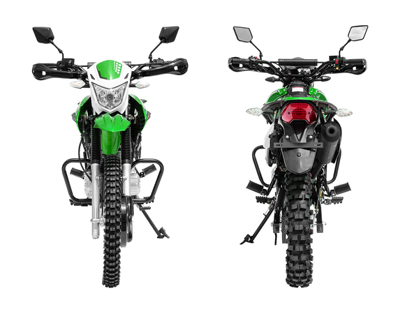 Regulmoto SK 200GY-5 – мотоцикл двойного назначения, созданный для эксплуатации как на дорогах общего пользования, так и на легком бездорожье. Топовая модель линейки лайт-эндуро мототехники известного китайского производителя Senke отличается высокой надежностью повседневной эксплуатации, отсутствием сложностей в сервисном обслуживании, простотой и легкостью управления.В надежной раме с защитными дугами Regulmoto SK 200GY-5 установлен 4-тактный одноцилиндровый двигатель с рабочим объемов в 20 см3, демонстрирующий максимальную мощность в 13.6 л.с. Мотор с воздушным охлаждением, в котором можно без труда признать реплику двигателя известного японского производителя, оснащается балансировочным валом, что позволяет избавиться от излишней вибрации.Подвеска мотоцикла на колесах 21/18 дюймов со стальными ободьями представлена телескопической вилкой-перевертышем спереди, перья которой закрыты защитой, и стальным маятником с моноамортизатором сзади. Тормоза у мотоцикла дисковые, спереди установлен 4-поршневой суппорт, сзади – 2-поршневой.Оснащение Regulmoto SK 200GY-5 соответствует возлагаемым на мотоцикл эксплуатационным задачам: на байке вполне комфортно передвигаться по дорогам и легкому бездорожью, чему способствуют достаточно большой ход амортизаторов, защита цепи, пластиковая защита рук. Среди установленного оборудования присутствуют: аналоговая приборная панель, замок зажигания с защитой от попадания песка и пыли, полный комплект светового оборудования с дополнительными светодиодными поворотниками, встроенными в боковые обтекатели, зеркала заднего вида, стояночная и центральная подножки.Данная модель мотоцикла присутствует на отечественном рынке мототехники уже достаточно длительное время, за которое мотоцикл зарекомендовал себя легким в эксплуатации и неприхотливым в обслуживании аппаратом. О высокой надежности мотоцикла говорят солидный километраж пробегов при отсутствии серьезных неисправностей и позитивные отзывы обладателей Regulmoto SK 200GY-5.У нас Вы можете купить этот мотоцикл с бесплатной доставкой по РФ и гарантией до года. Также его можно приобрести в рассрочку или в кредит.
