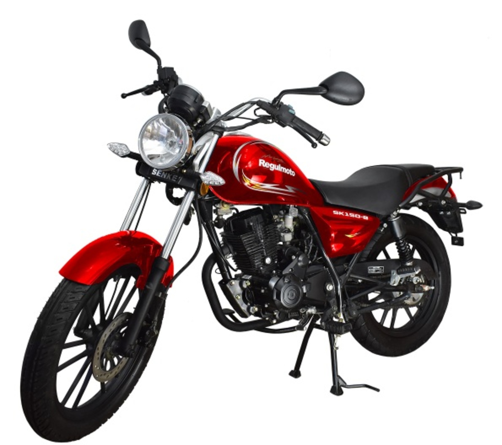 Несмотря на классический внешний вид Regulmoto SK 150-8 отличается достаточно интересным и продуманным дизайном. В раме мотоцикла установлен одноцилиндровый 4-тактник с воздушным охлаждением с рабочим объемом в 149 см3. Двигатель можно запускать как кнопкой электростартера, так и при помощи традиционного кик-стартера. В целом байк выглядит лаконичным и современным – еще одной приметой актуальных трендов стали литые диски переднего 18-дюймового и заднего 16-дюймового колес. Также на переднем колесе установлен дисковый тормоз, хотя в ступице заднего колеса реализован проверенный многими десятилетиями вариант с тормозом барабанного типа. Характерная для «дорожников» подвеска представлена телескопической вилкой впереди и двумя амортизаторами сзади.