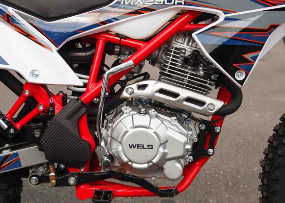 Представляем Вам новую модель мотоцикла от компании WELS - Мотоцикл WELS MX-250 R 2019-го года выпуска. У нас Вы можете купить этот мотоцикл с бесплатной доставкой по РФ и гарантией до года. Также его можно приобрести в рассрочку или в кредит. Мотоцикл WELS MX-250 R является надежным и комфортным в эксплуатации. В раме на колесах 21/18 с стальными ободьями и буксаторами установлен проверенный 4-тактный двигатель с воздушным охлаждением Zongshen 165FMM. Подготовкой топливной смеси для двигателя занимается карбюратор KEIHIN; технический потенциал силовой установки мотоцикла позволяет продемонстрировать 17 «лошадей» максимальной мощности. Подвеска аппарата представлена традиционными вилкой-перевертышем спереди, а также маятником, линком прогрессии и моноамортизатором .Высокая надежность, удобство управления в сложных условиях бездорожья, а также простота сервисного обслуживания обеспечена подбором качественных комплектующих и компонентов мотоцикла.