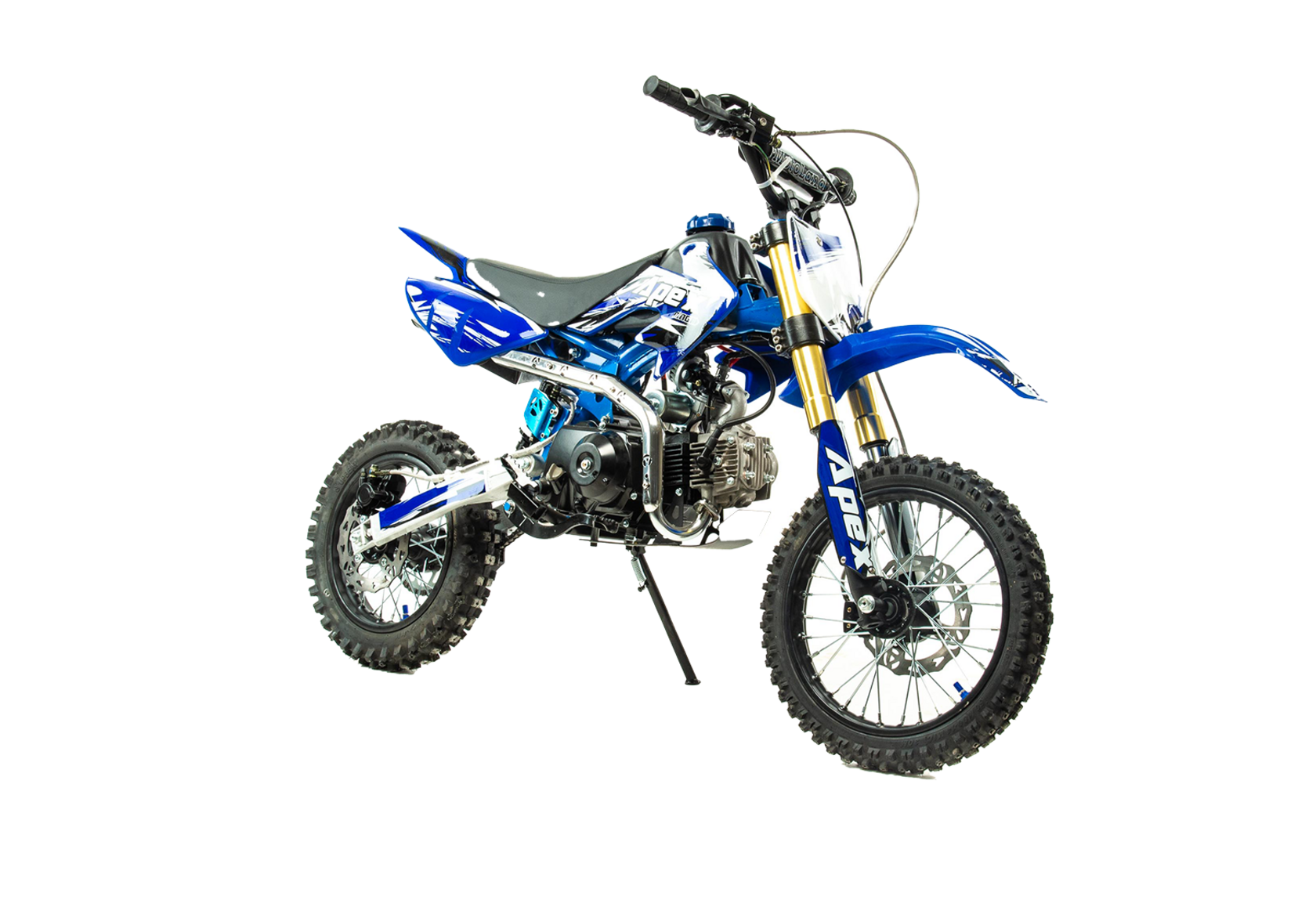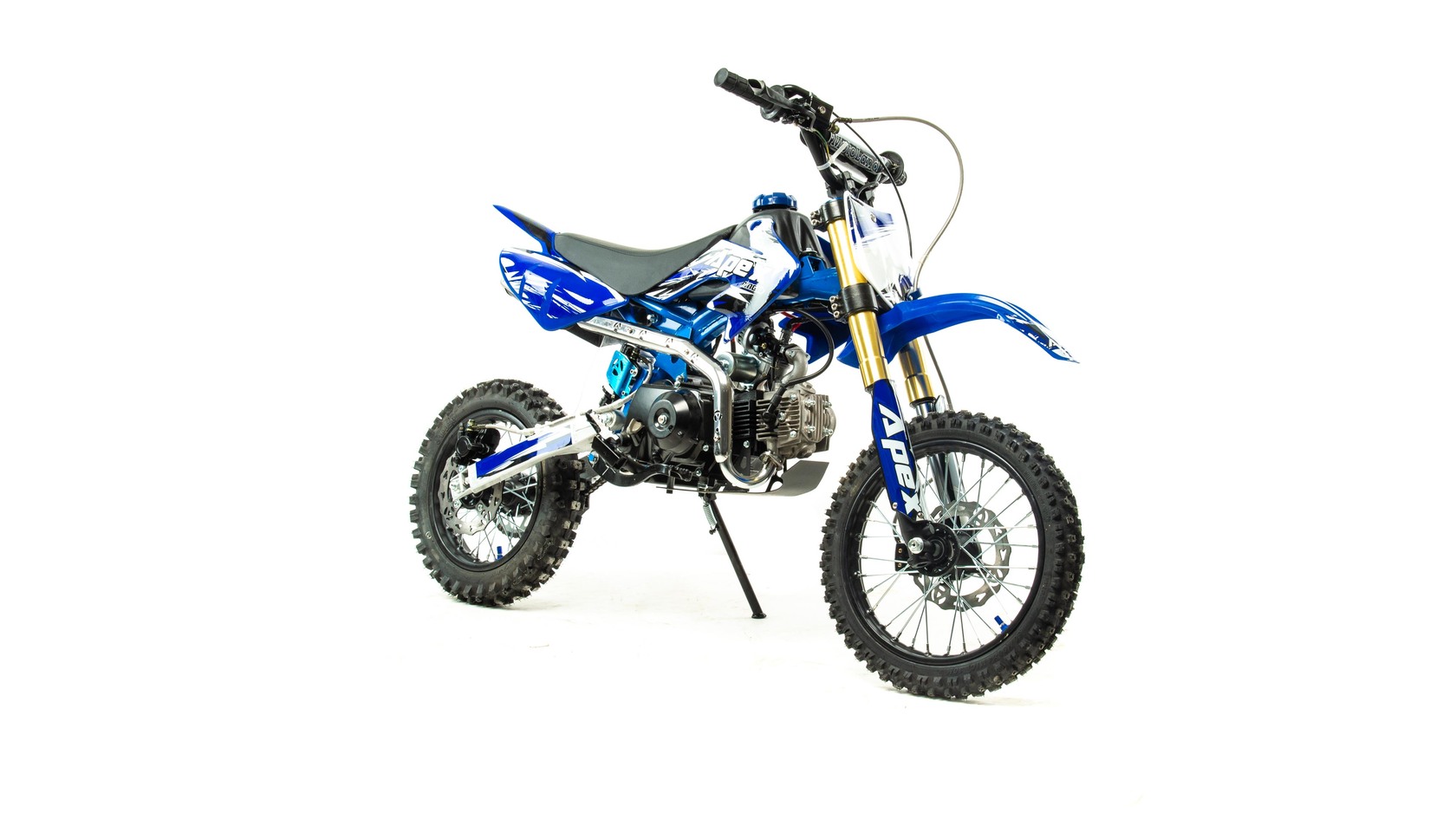 едорогой надёжный питбайк APEX10 идеален для поездок по грунтовым дорогам и бездорожью для детей которые уже научились ездить на маленьких мотоциклах объемом 50 куб.см. Хорошо чувствует себя на мягком и среднем грунте, разгоняется до 70 км/ч. Оснащён CNC траверсами, фарой, алюминиевыми ободами, весит всего 65 кг. Питбайк прост в управлении и не требует специального ухода.У кроссового мотоцикла APEX10 отличный узнаваемый дизайн. Конструкция подчёркивает неуступчивый спортивный характер питбайка, который не остановится ни перед одним препятствием. Пластик комбинированный, прочный, не ломается при сгибании. Кроссовый мотоцикл APEX10 доступен в красном и синем цвете, при этом в основной цвет окрашен не только пластик, но и обода колёс и другие детали питбайка.Передняя подвеска — телескопическая нерегулируемая вилка перевёрнутого типа, которая отлично подходит для преодоления ям, ухабов и других неровностей плохих дорог или их отсутствия. Задняя подвеска маятниковая с моноамортизатором. Руль 22 мм с высоким подъёмом и перекладиной удобен для мотоциклистов разного роста. Питбайк оснащён складными рычагами сцепления и переднего тормоза, а также CNC-лапкой переключения передач.Питбайк весит всего 65 кг, при этом выдерживает вес до 120 кг. Оснащён CNC траверсами, рама полудуплексная стальная, мотоцепь качественная. Колёса спицованные, сделаны из прочного и лёгкого алюминия. Размер заднего колеса — 12 дюймов, переднего — 14 дюйм. Тормоза дисковые, передний тормозной суппорт двухпоршневой, задний — однопоршневой.Питбайк оснащён карбюратором с фильтром нулевого сопротивления VM22 MIKUNI и одноцилиндровым четырёхтактным двигателем с воздушным охлаждением. Надёжный мотор мощностью 8 л. с. и объемом 110 см³ разгоняет кроссовый мотоцикл APEX10 до 70 км/ч. Коробка передач автоматическая, четырёхступенчатая. Система зажигания электронная (CDI), для запуска двигателя можно использовать кикстартер. Сверхпроходимость Покрышки с шипами и высоким грунтозацепом идеальны для бездорожья. Мощность мотора и небольшой вес питбайка позволяют ему преодолевать значительные препятствия и непролазную грязь, хорошо заходить в подъёмы.