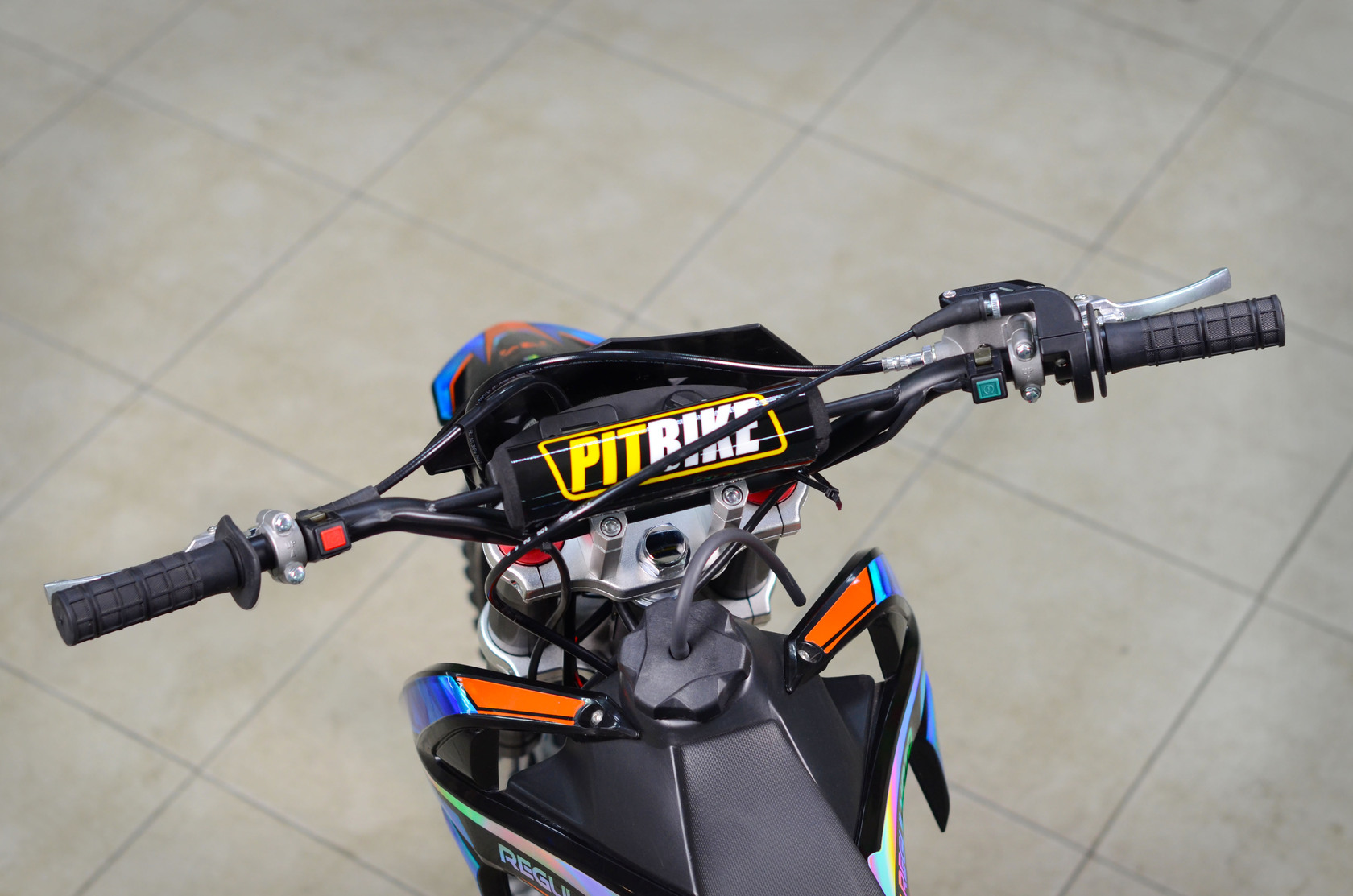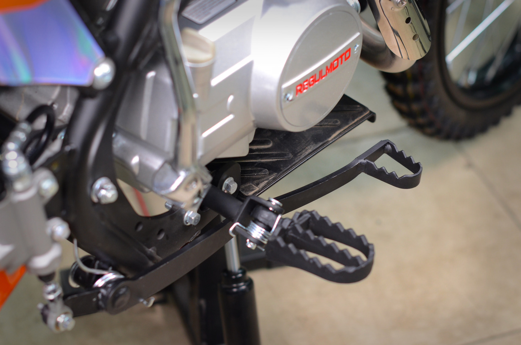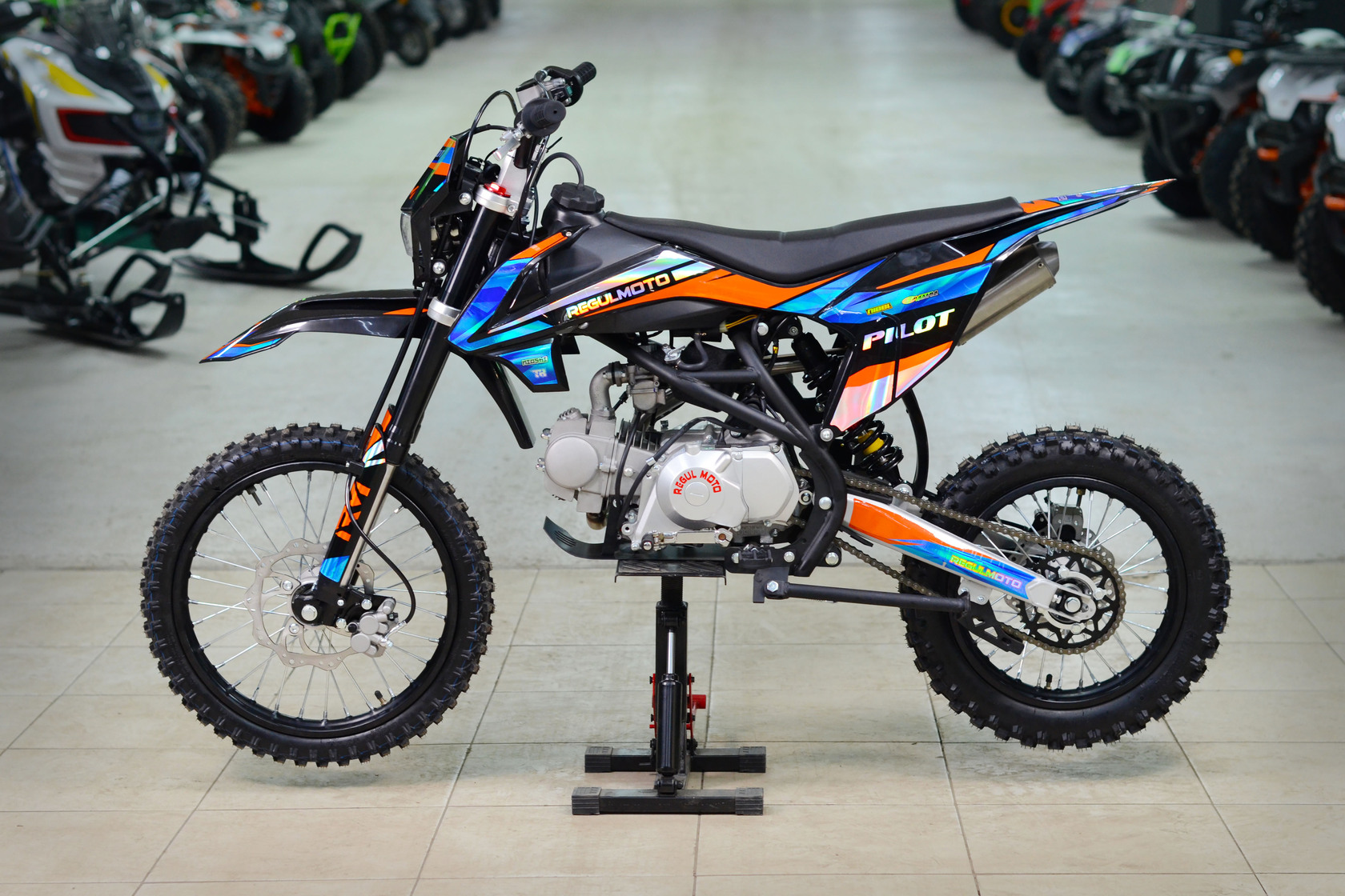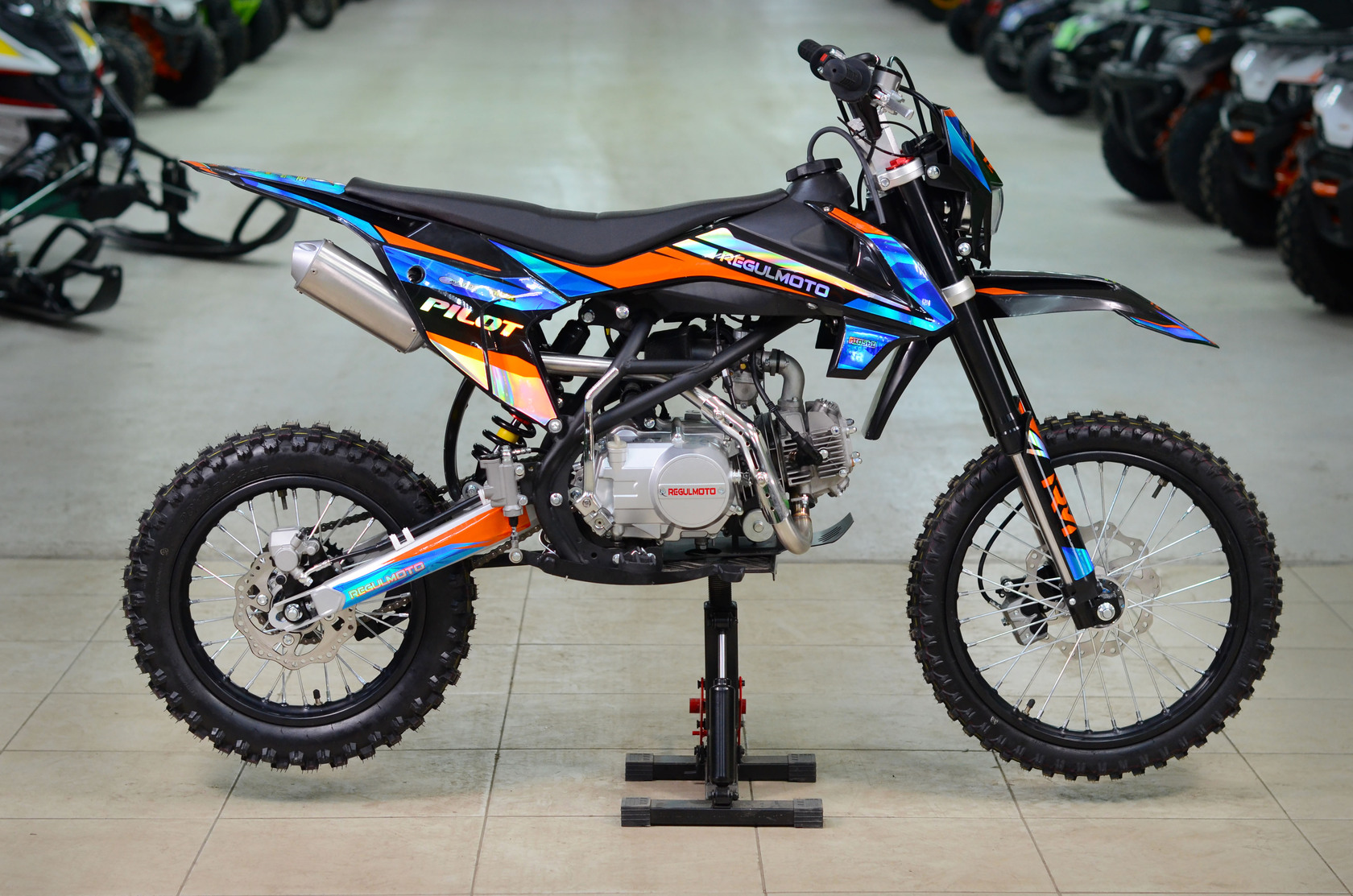 .Regulmoto Pilot c электростартером и классической механической коробкой передач– питбайк начального уровня, созданный специалистами Американского мотобренда PitsterPro для юных мотогонщиков.Данная модель представляет линейку мототехники Regulmoto модельного ряда 2023 года, отличается высокой надежностью и простотой в эксплуатации.В прочной и надежной раме питбайка стоит 4х-тактный двигатель YX воздушного охлаждения с 4-ступенчатой классической механической трансмиссией.Высокий класс используемых комплектующих обеспечивают необходимый для внедорожной мототехники уровень надёжности и комфорта.Яркая светодиодная фара позволяет использовать питбайк также в тёмное время суток.В 2023 году Regulmoto Pilot получил ряд обновлений – кроме нового дизайна графики, изменения коснулись дизайна пластикового обвеса, подножек, рычагов тормоза, переключения передач и глушителя.Эта модель рассчитана на детей и подростков возрастом от 7 до 15 лет.Наличие классической механической трансмиссии позволяет детям и подросткам с минимальным опытом управления двухколесной мототехникой быстро освоить основы и совершенствовать навыки вождения на бездорожье.