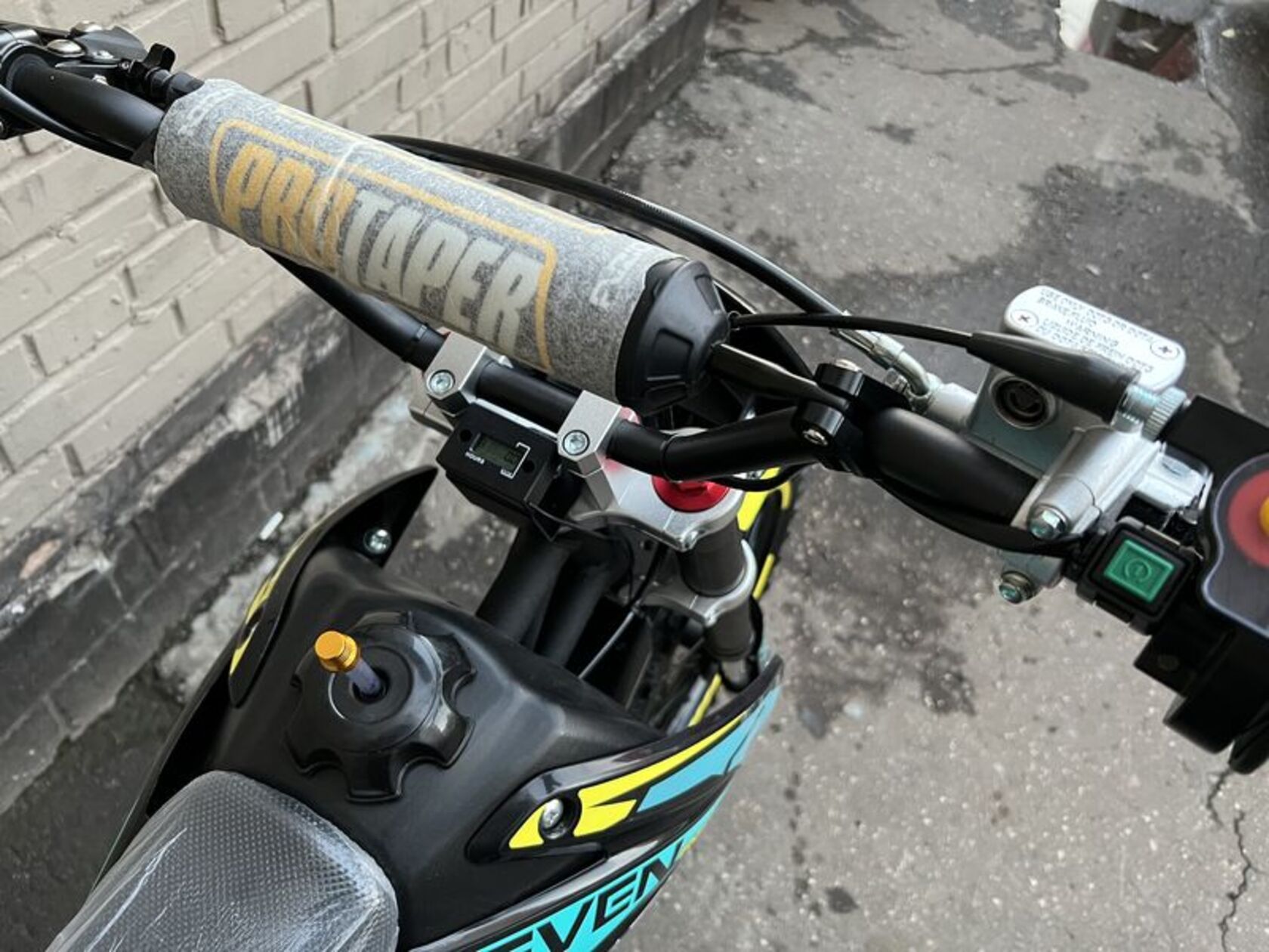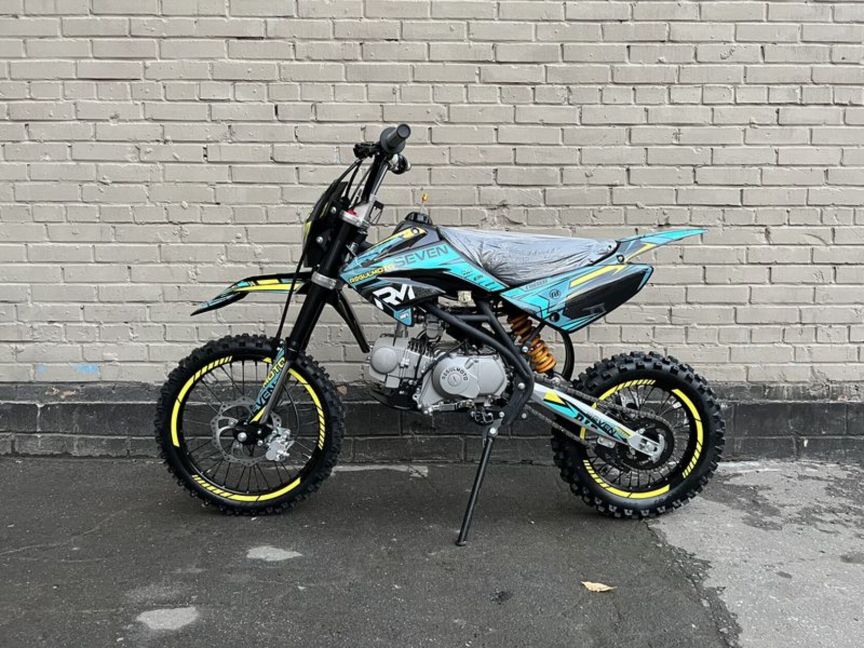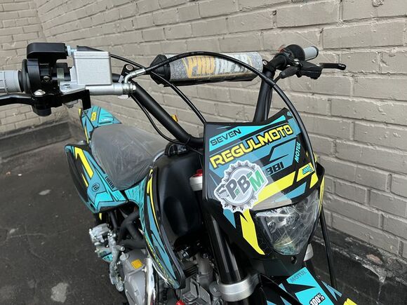 .Представляем вниманию поклонников офф-роада и фри-райда питбайк Regulmoto Seven – новинку мототехники Regulmoto модельного ряда 2020 года. Regulmoto Seven – оптимальный выбор для райдера, который позволит своему владельцу совершенствовать навыки управления мототехникой на треке мотостадиона, а также получать максимальное удовольствие от офф-роад рейдов.В раме Regulmoto Seven установлен 125-кубовый 4-тактник YX с электростартером– этот двигатель отлично себя зарекомендовал в качестве надежного и простого силового агрегата. Подготовкой топливной смеси занимается карбюратор Nibbi PE19. Запуск мотора возможен как при помощи кнопки электростартера, так и привычной лапкой кика.Колеса питбайка размером 17/14 дюймов с усиленными алюминиевыми ободьями на 36 спиц «обуты» в качественную кроссовую моторезину Kenda. Установленные на колесах буксаторы предотвратят проворачивание покрышки и защитят камеры от возможных повреждений. Питбайк комплектуется фарой головного света; она включается при помощи поворота ключа в замке зажигания. В качестве элементов защитного обвеса используются пластиковые обтекатели типа CRF.Подбор комплектующих свидетельствует о полной готовности питбайка к покорению бездорожья. Среди стоковых компонентов мини-мотоцикла стоит отметить: